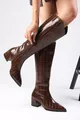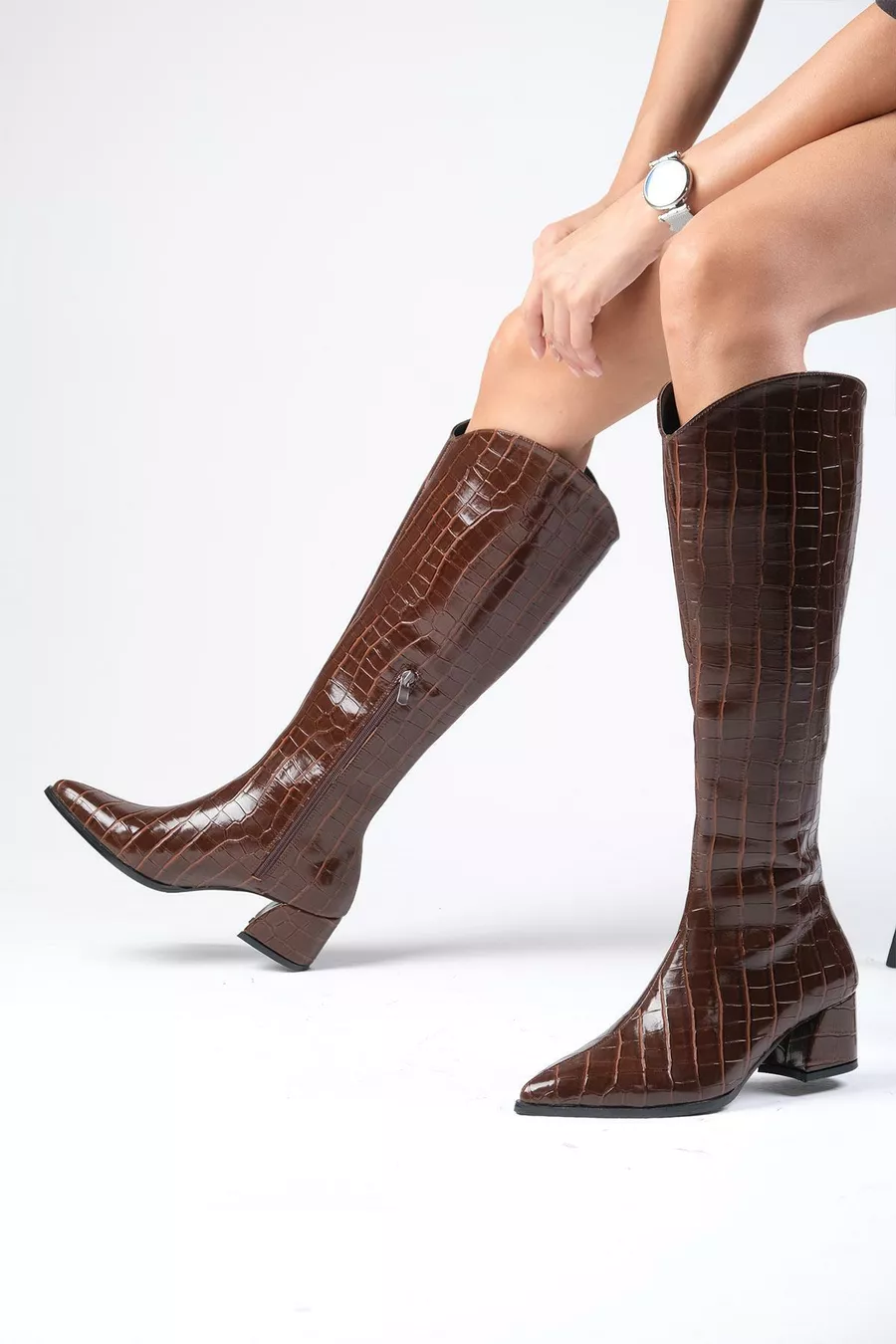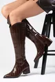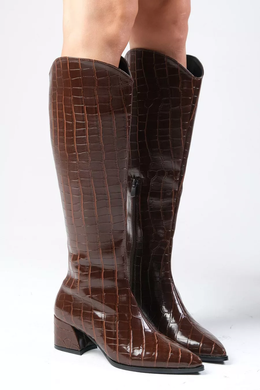 Scarpa con Tacco da Donna in Pelle di Coccodrillo Marrone Siena, Lato con Mezza Cerniera, Foderata in Pelliccia Sottile