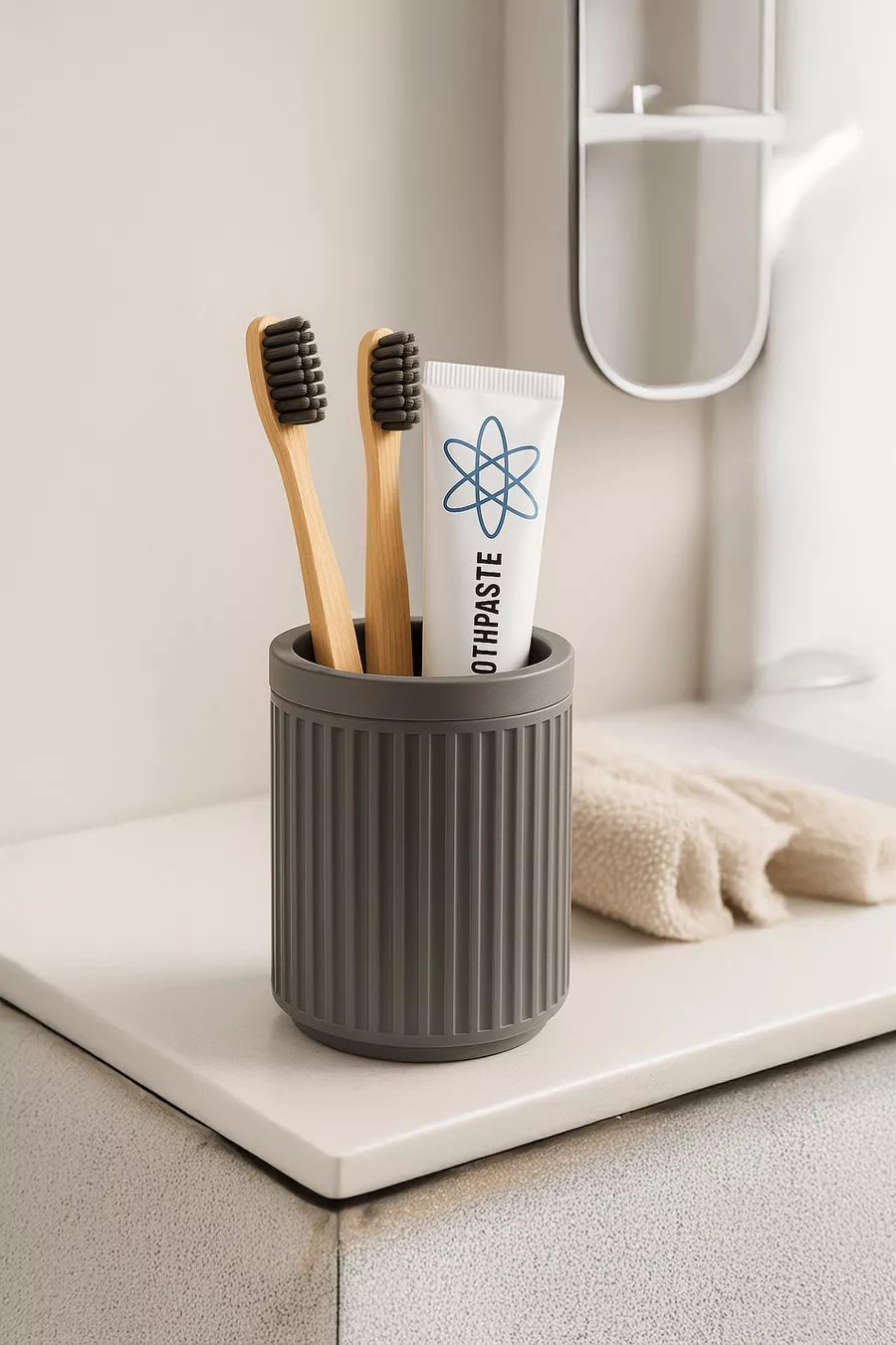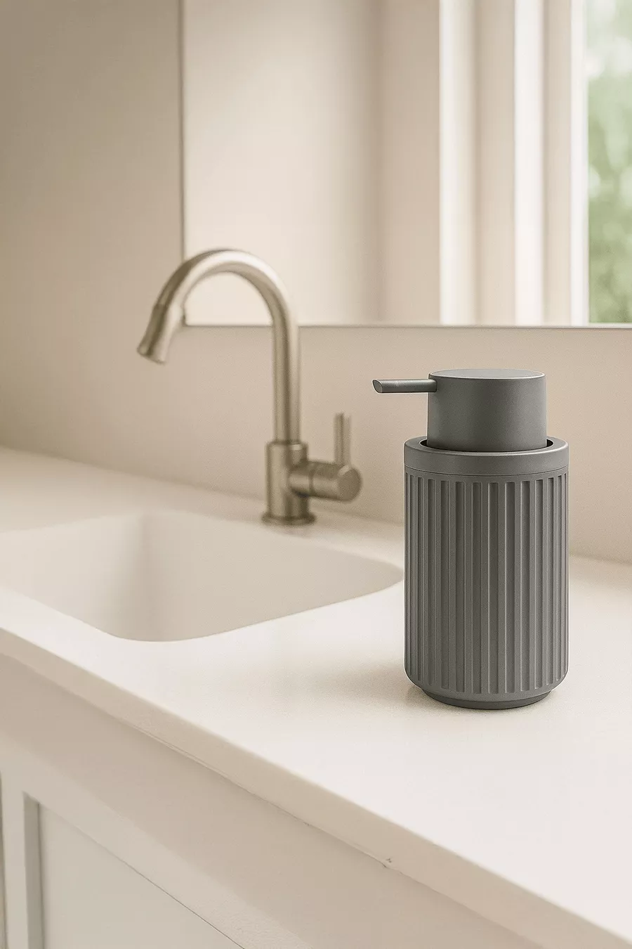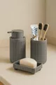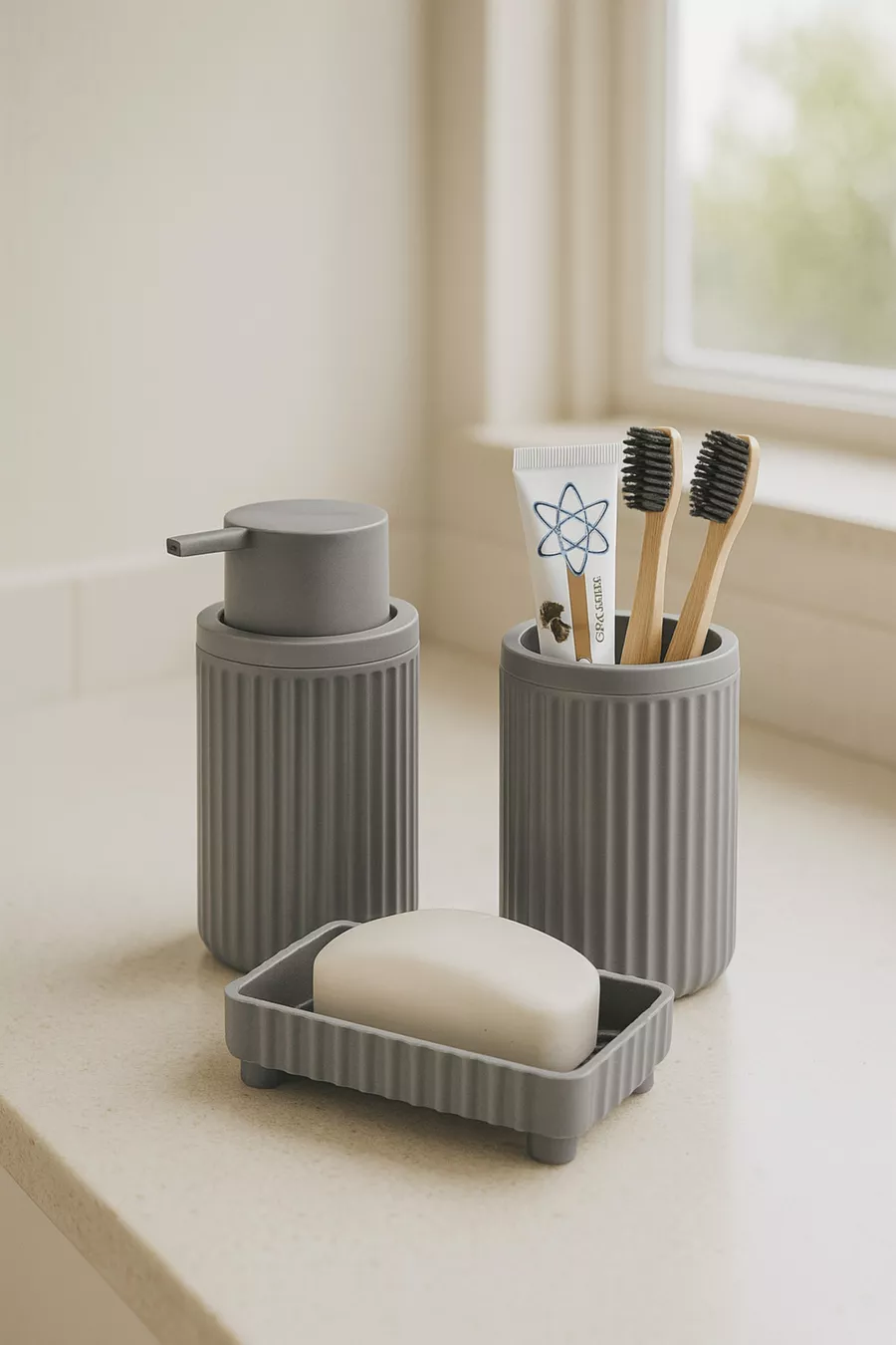 Set da Bagno Grigio della Serie Lines, Set di 3 Pezzi con Portasapone Ovale, Porta Spazzole e Dispenser per Sapone Liquido -