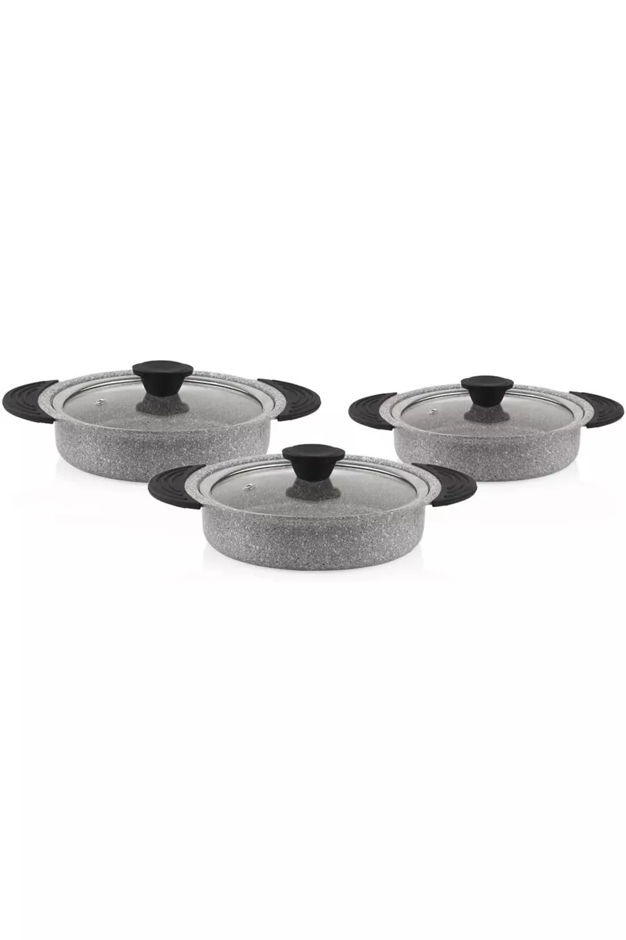 Colore: Grigio Dimensione/Formato: 18 cm Capacità: 2,3 L Caratteristica: Fondo antiaderente Materiale esterno: Granito Materiale interno: Granito Numero di pezzi: 3 Materiale: Granito