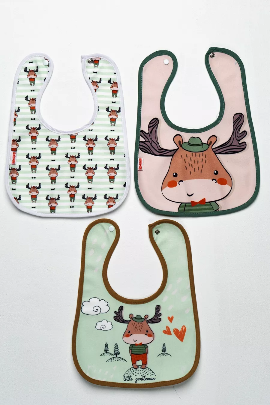 Set di 3 bavaglini quadrati in microfibra a tema cervo, con chiusura a bottoni, impermeabili, nella propria confezione