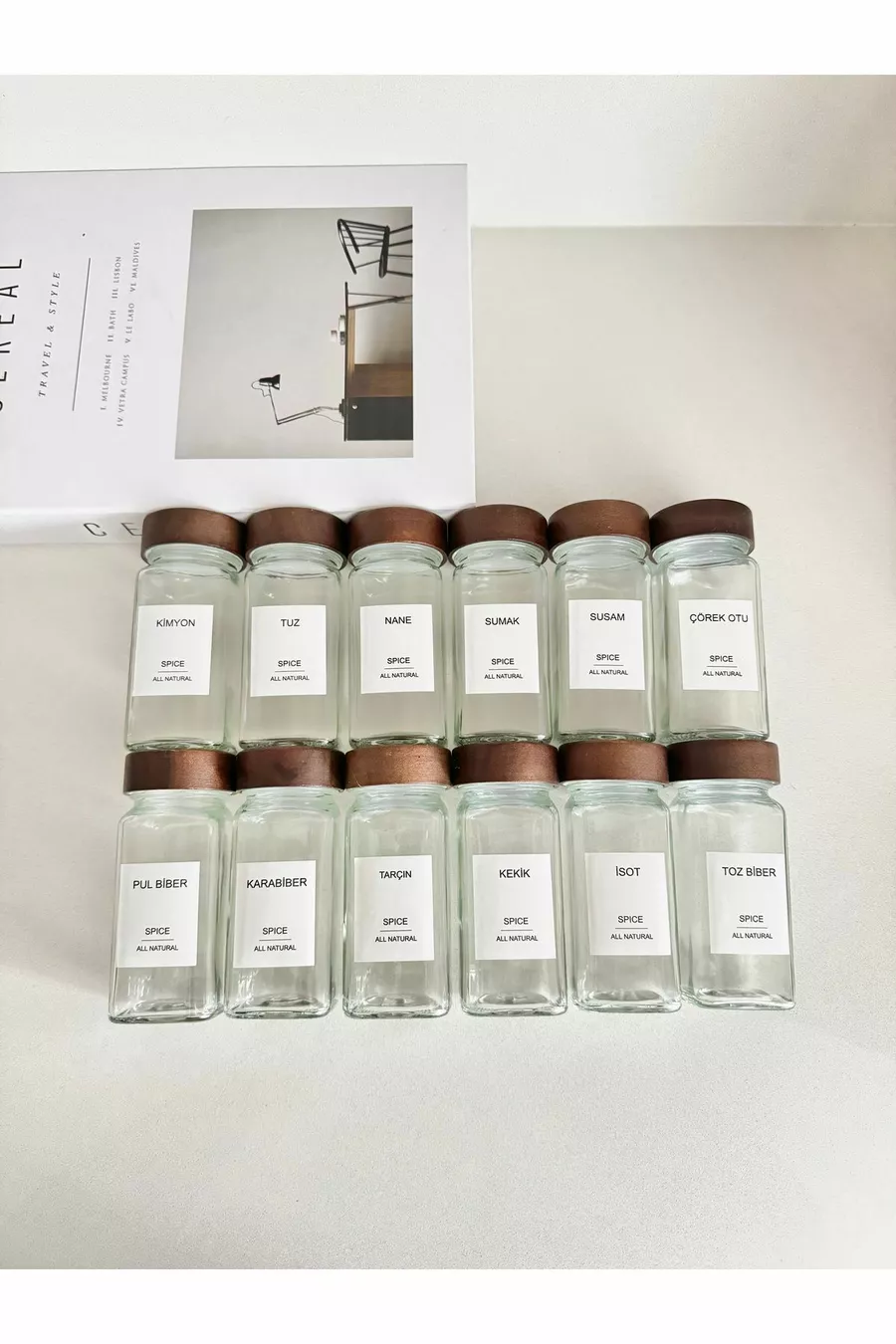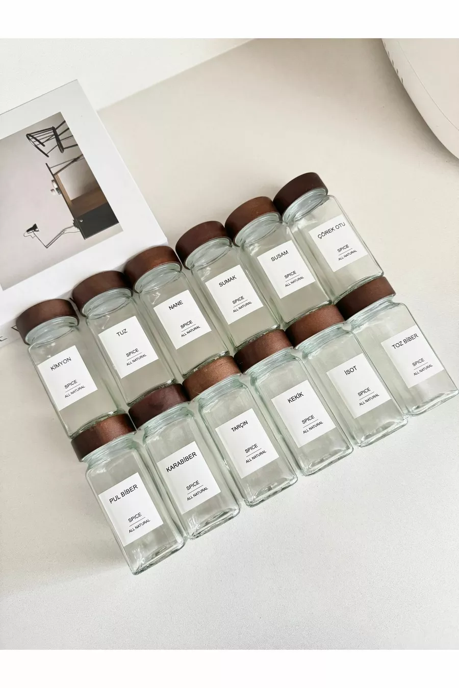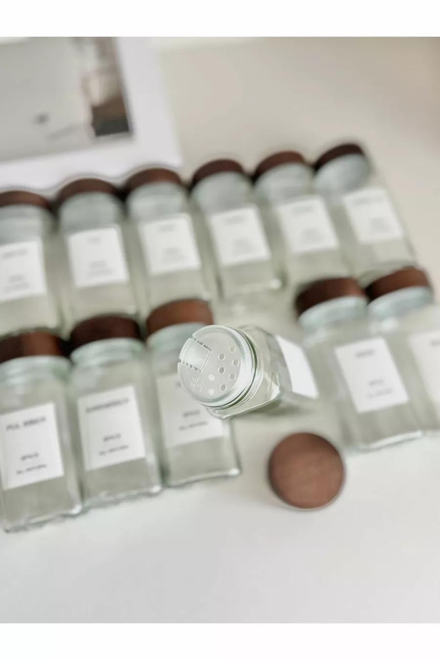 Set di barattoli per spezie in vetro quadrati con coperchio in acacia / Etichetta per pezzo
