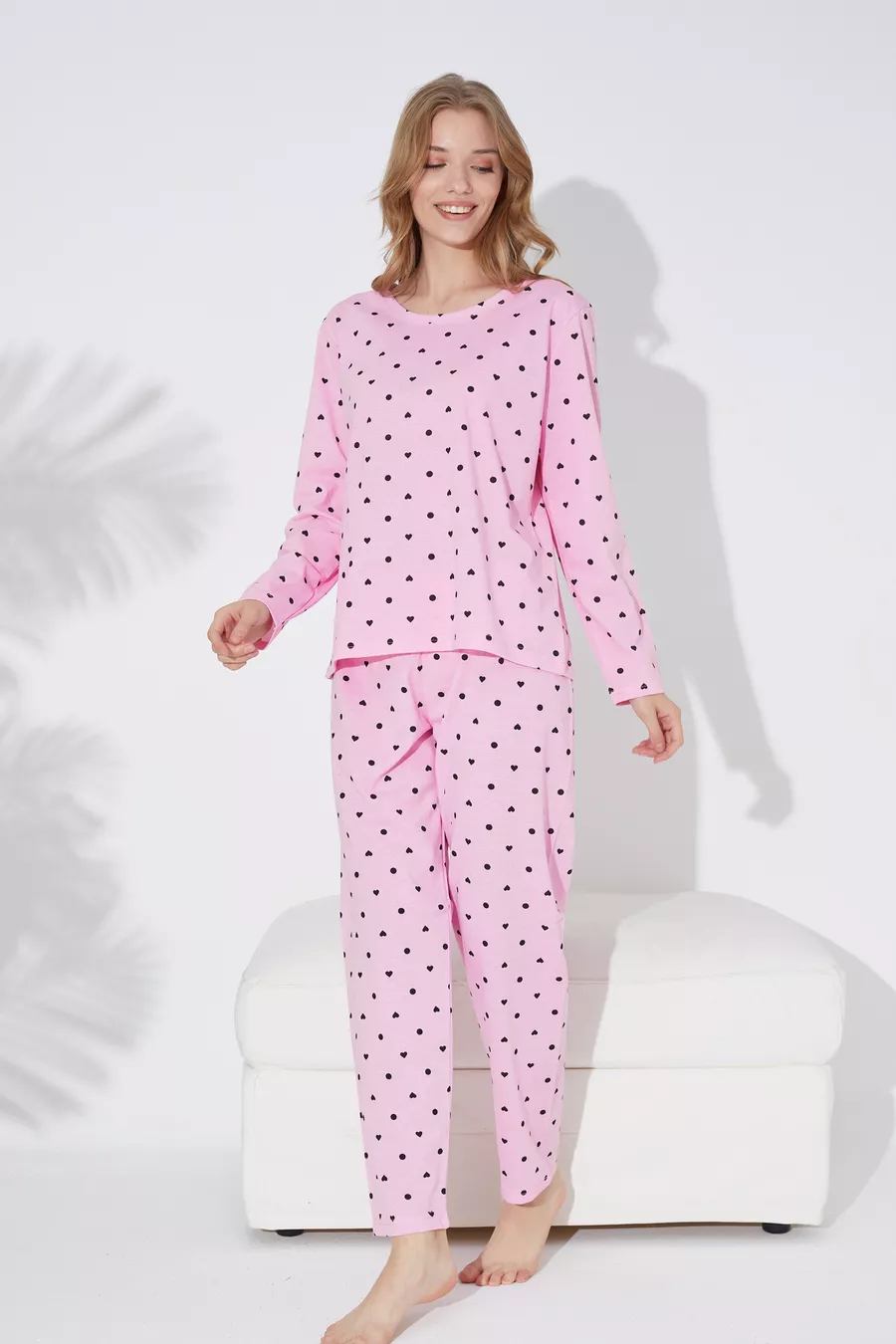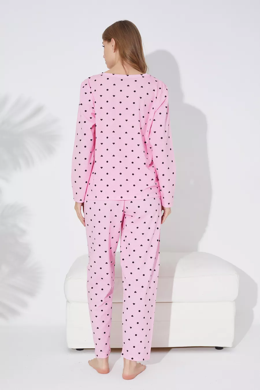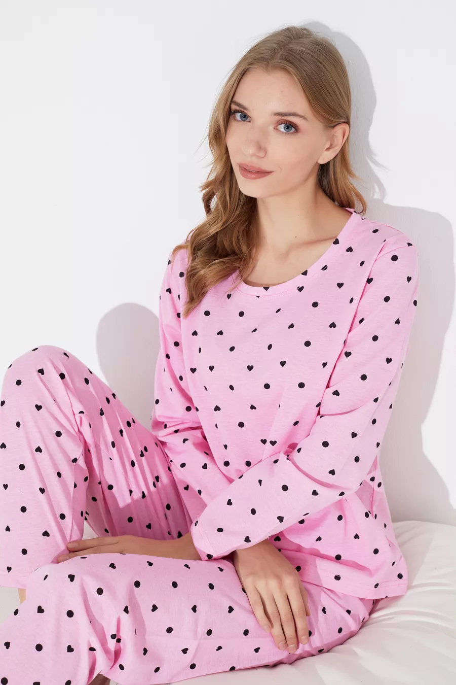 Set di Pigiama in Maglia con Cuori Rosa e Neri e Motivo a Pois