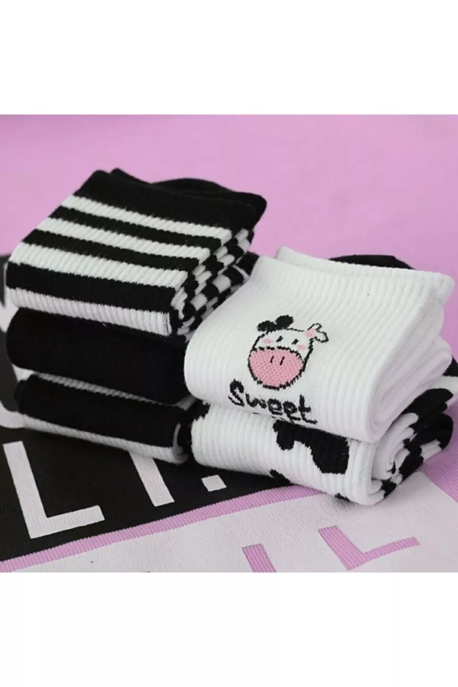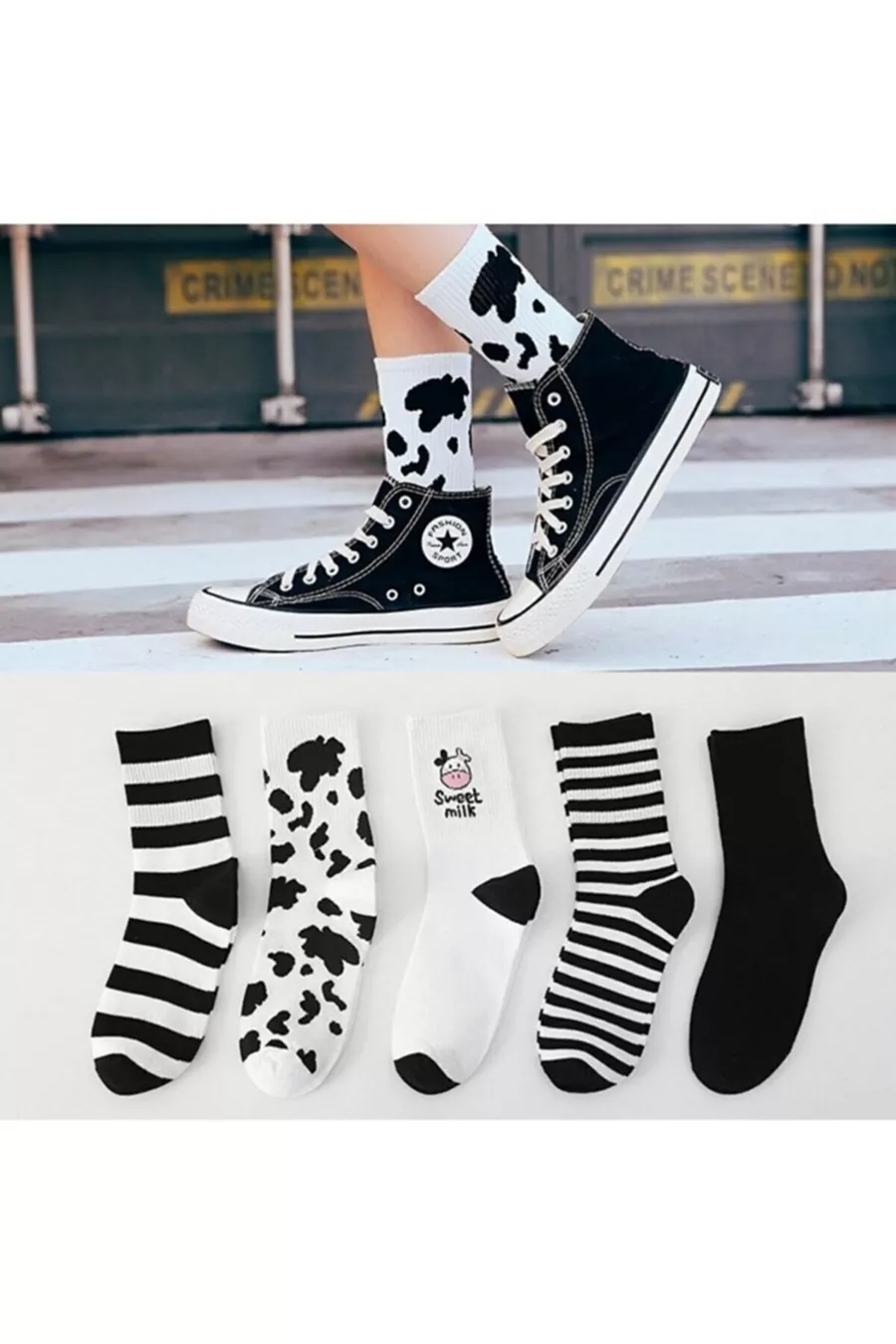 Set di 5 paia di calze da college femminili con motivo mucca bianco e nero