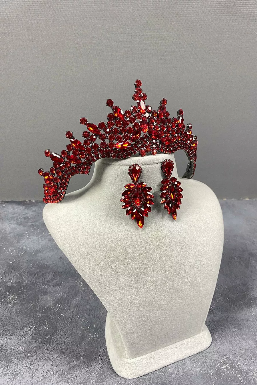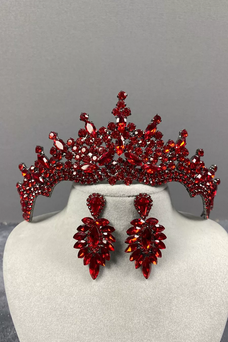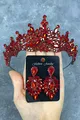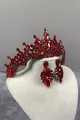 Set di corona da sposa con pietre rosse di Tokyo e orecchini a navetta