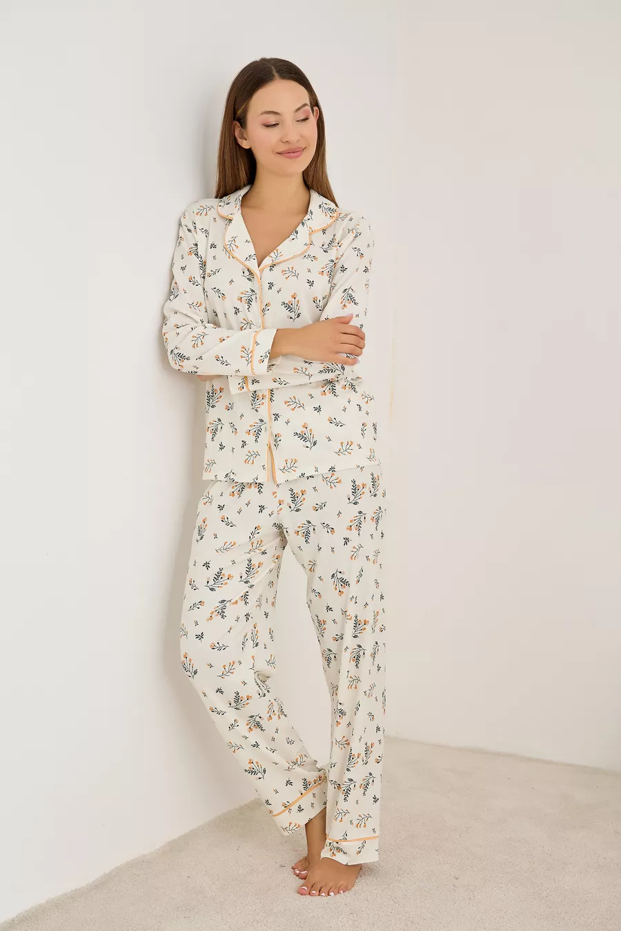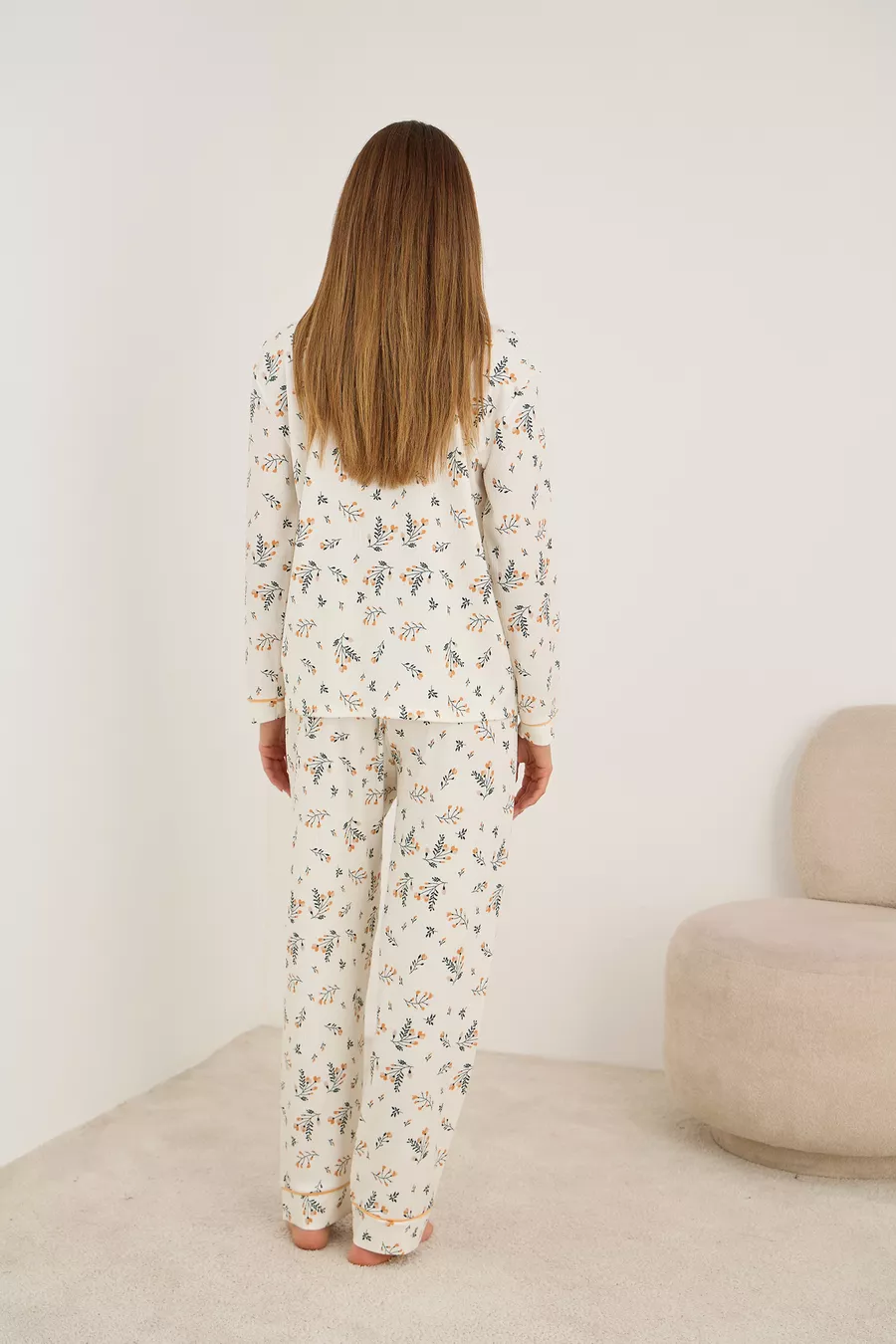 Set di pigiama con bottoni e profilo, a maniche lunghe in crincle-bürümcük, con motivo a foglie color ecrù