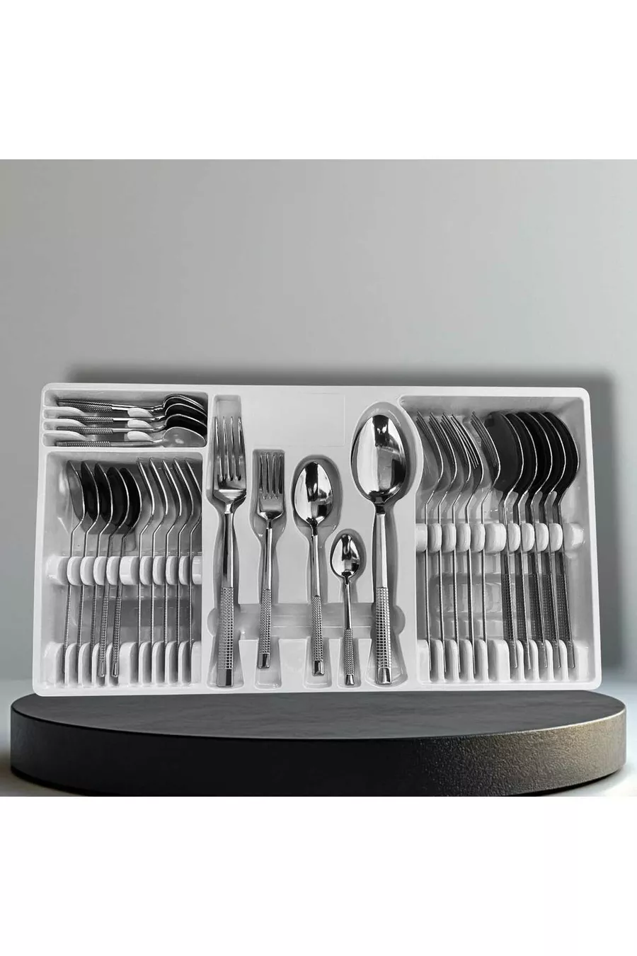 Materiale: Acciaio Inossidabile Numero di Pezzi: 30 Colore: Argento Capacità: Per 6 persone Tipo di Prodotto: Set di Forchette e Cucchiai Provenienza: TR Periodo di Garanzia: 10 Anni Istruzioni per la Cura (Contatto con Alimenti): Lavabile in lavastoviglie.