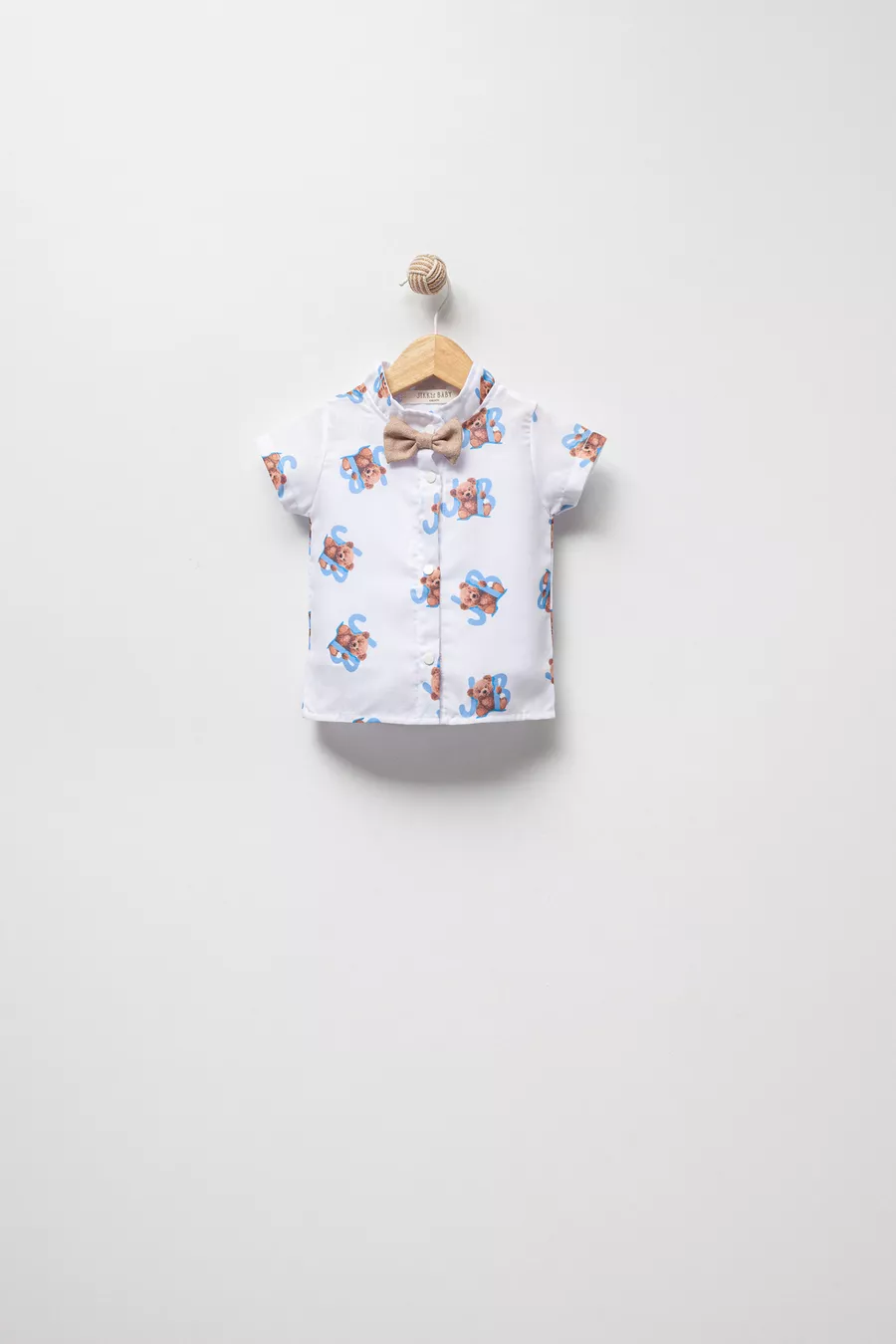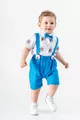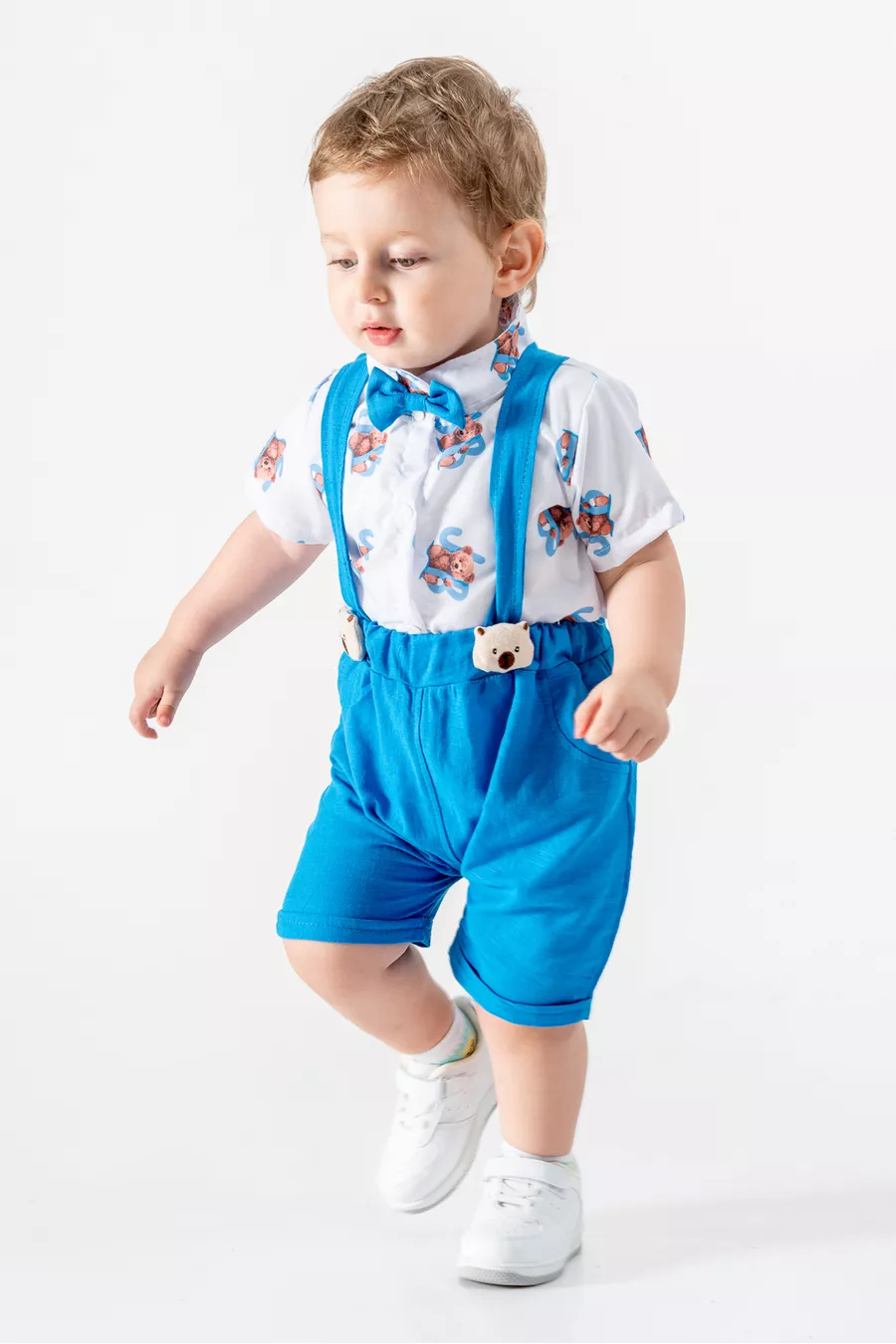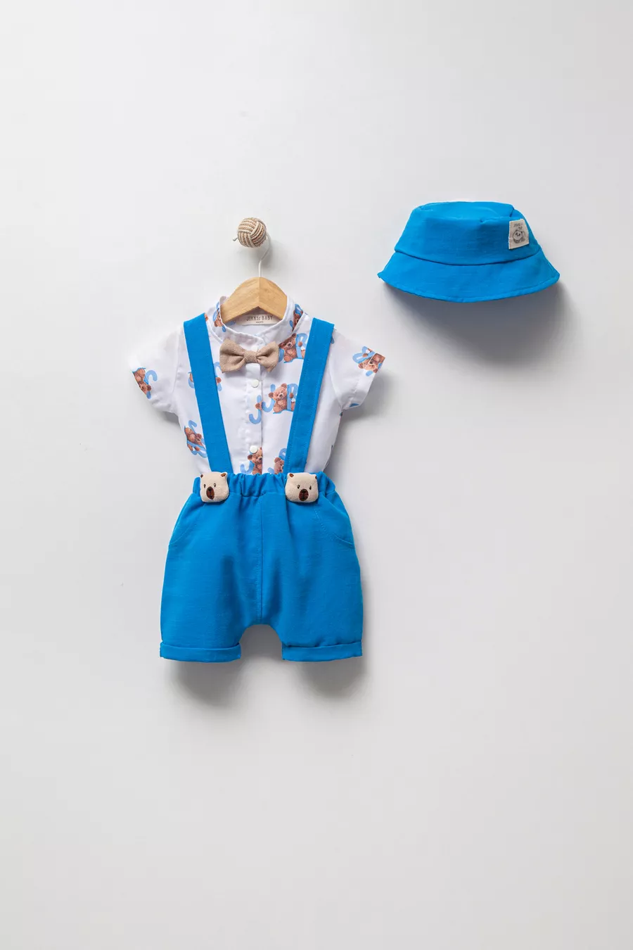 Set di 3 salopette estive in mussola con camicia e orsetto con papillon