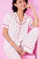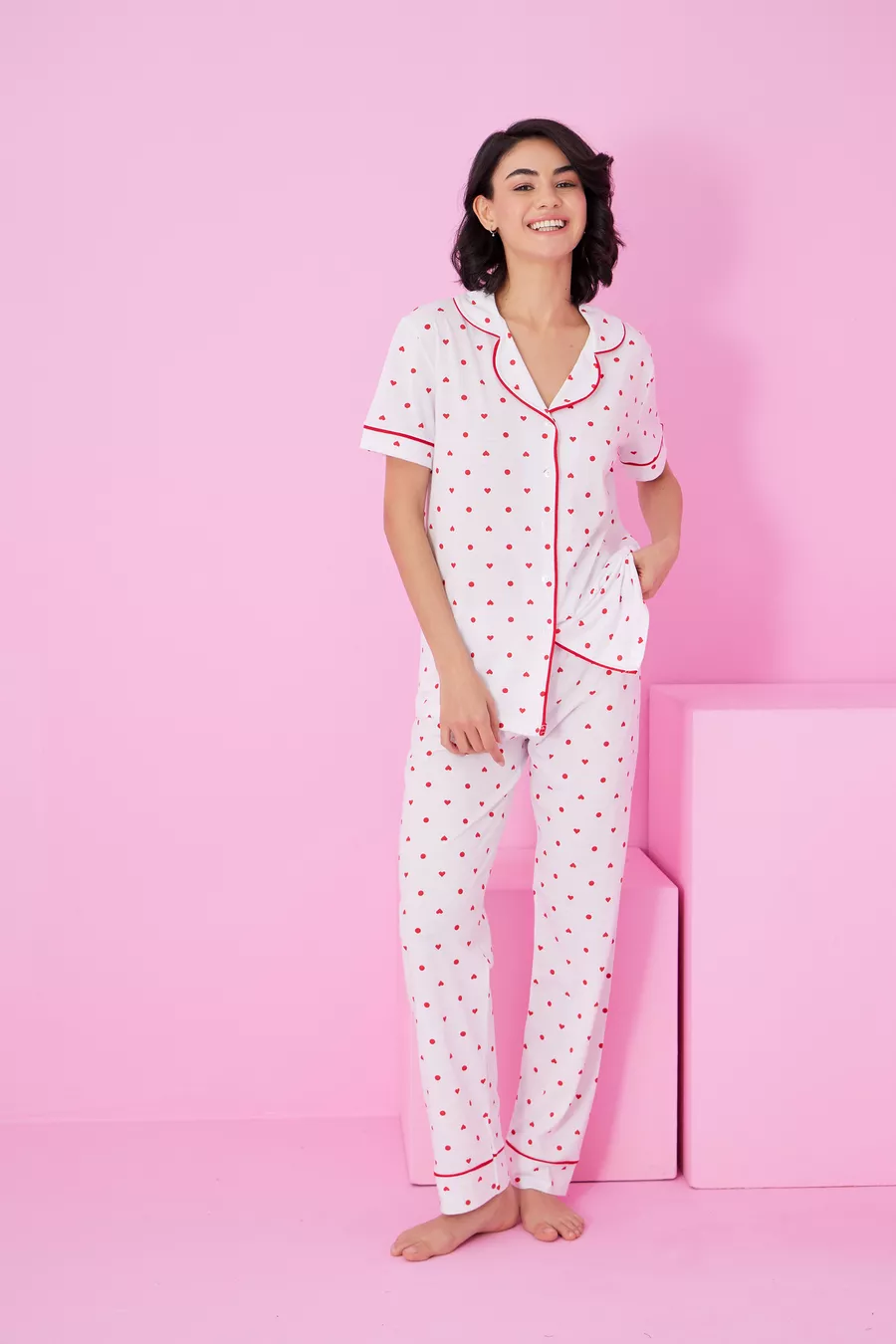 Set di pigiama con bottoni e bordo a motivo cuori bianchi e rossi, maniche corte
