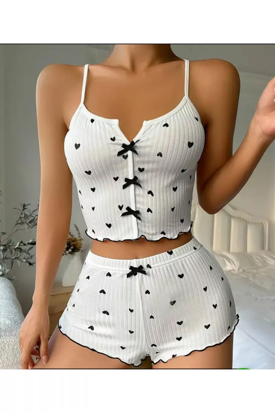 Set Pigiama Donna Bella con Top Bianco a Spalline e Pantaloncini a Fantasia