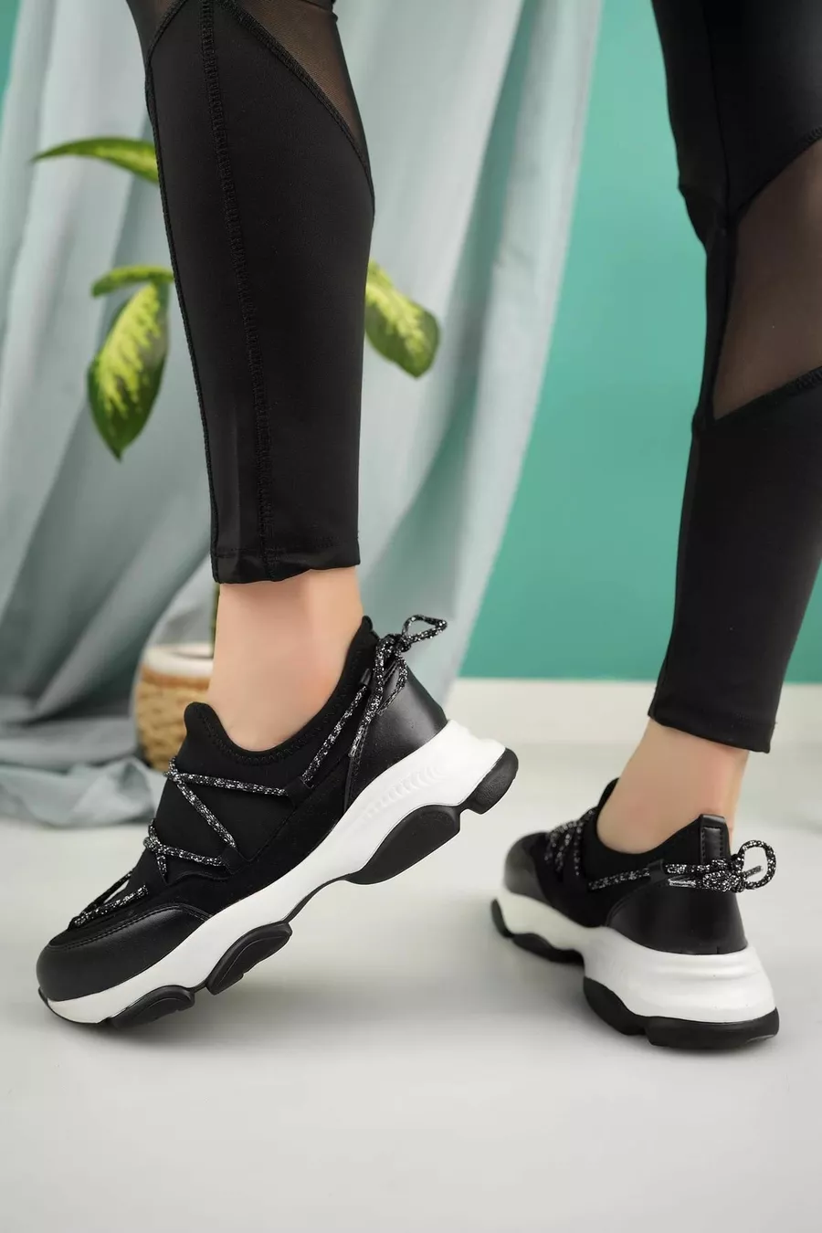 Sneaker stringata a righe elastiche con suola in poliestere nera da donna