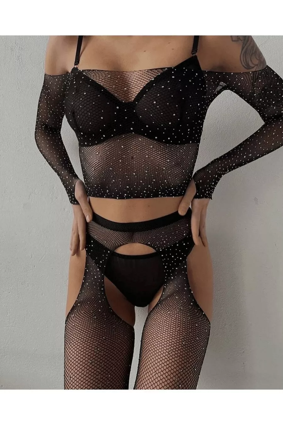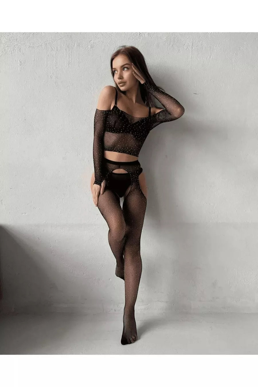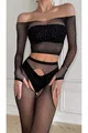 Top a rete corta scintillante con diamanti luccicanti, set di blusa corta