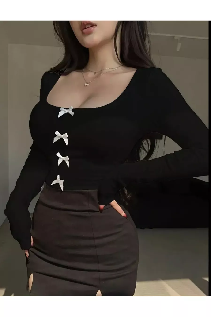 Top corto in maglia nera con scollo quadrato e dettagli a nastro
