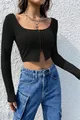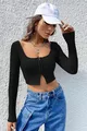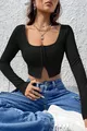 Top corto da donna nero con maniche lunghe, con ganci, scollatura sul petto e sull'addome