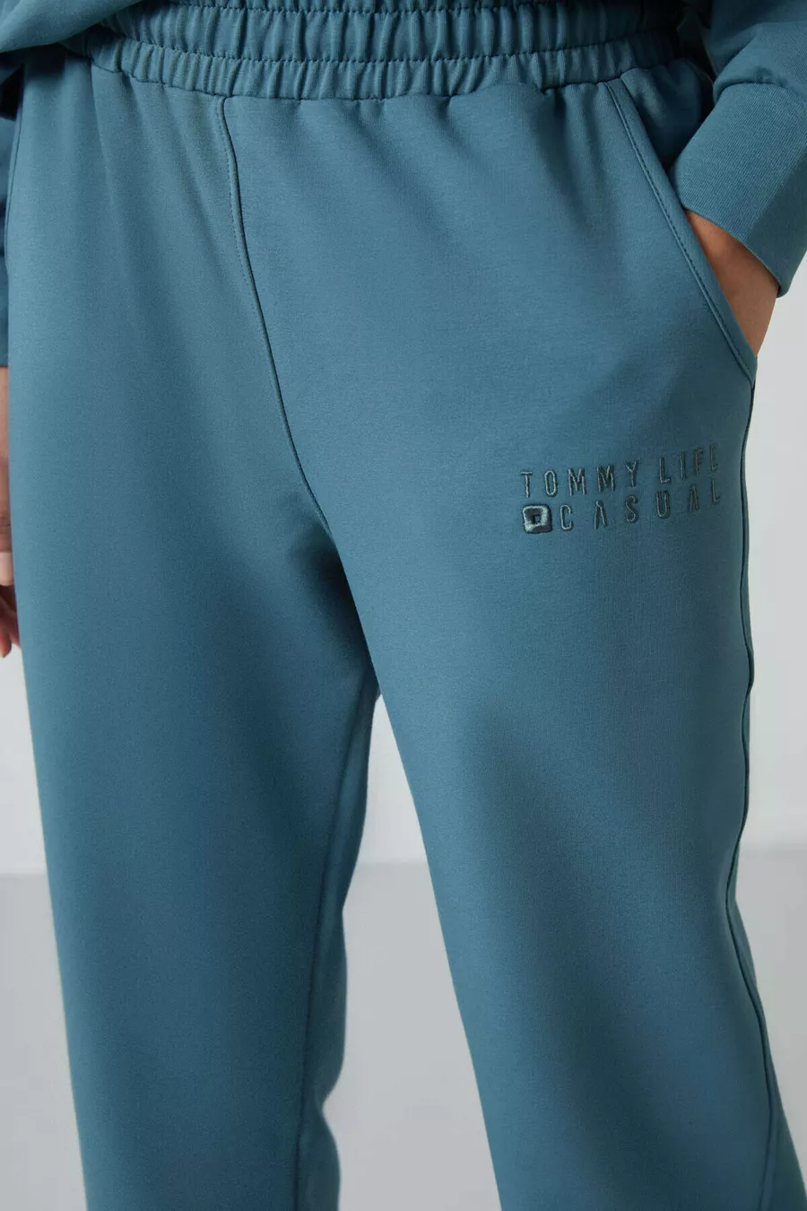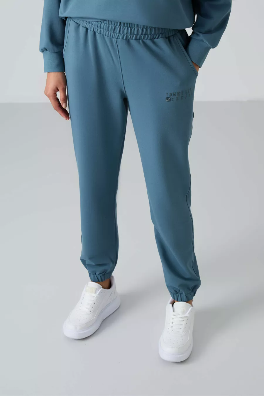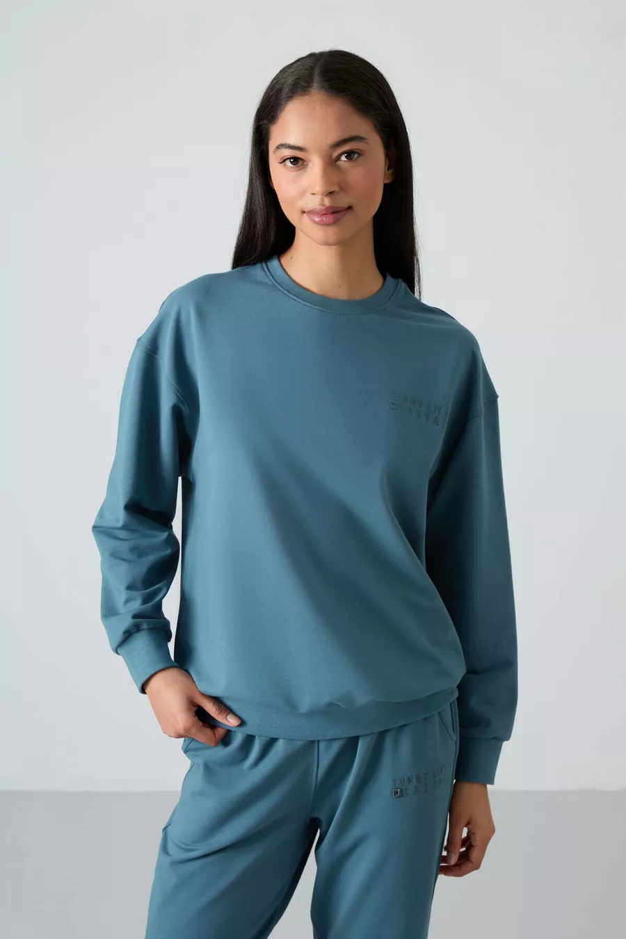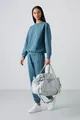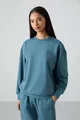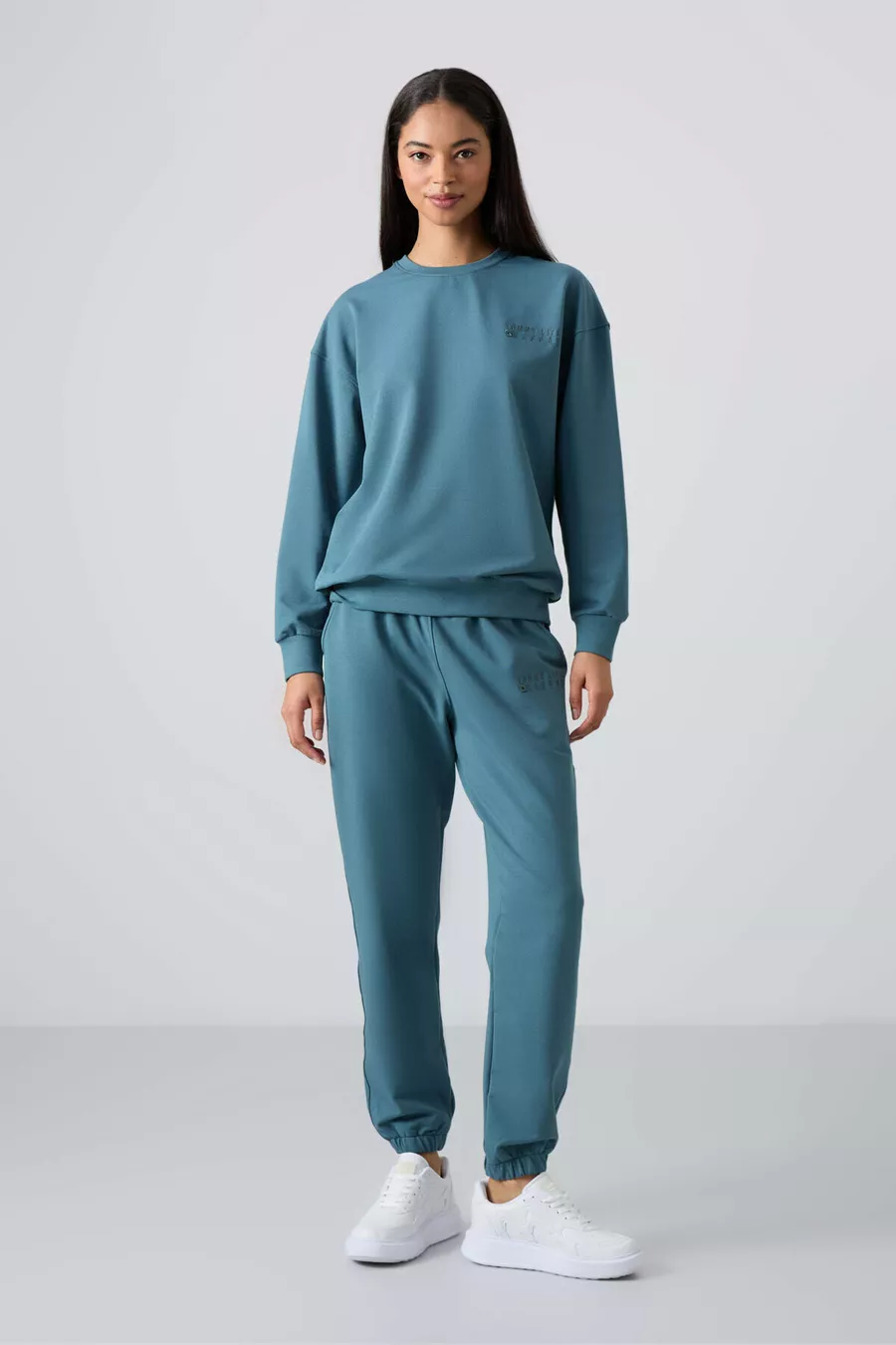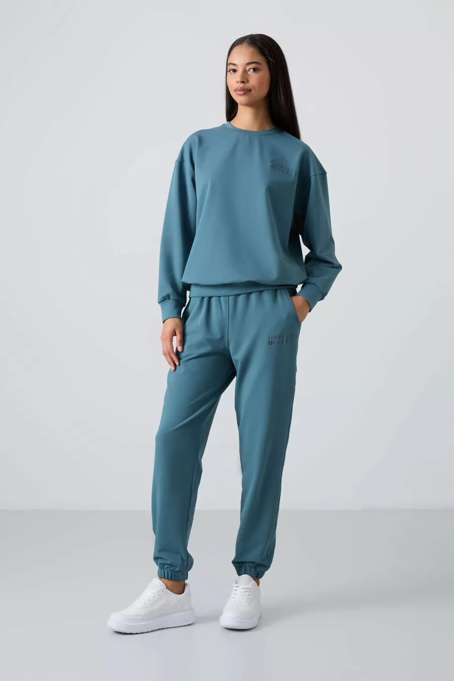 Tuta da donna in cotone verde foresta Basic con collo a O oversize e pantaloni con polsini elasticizzati -
