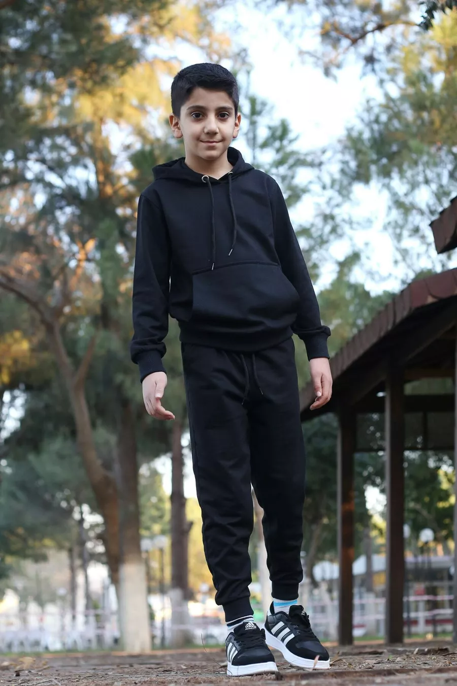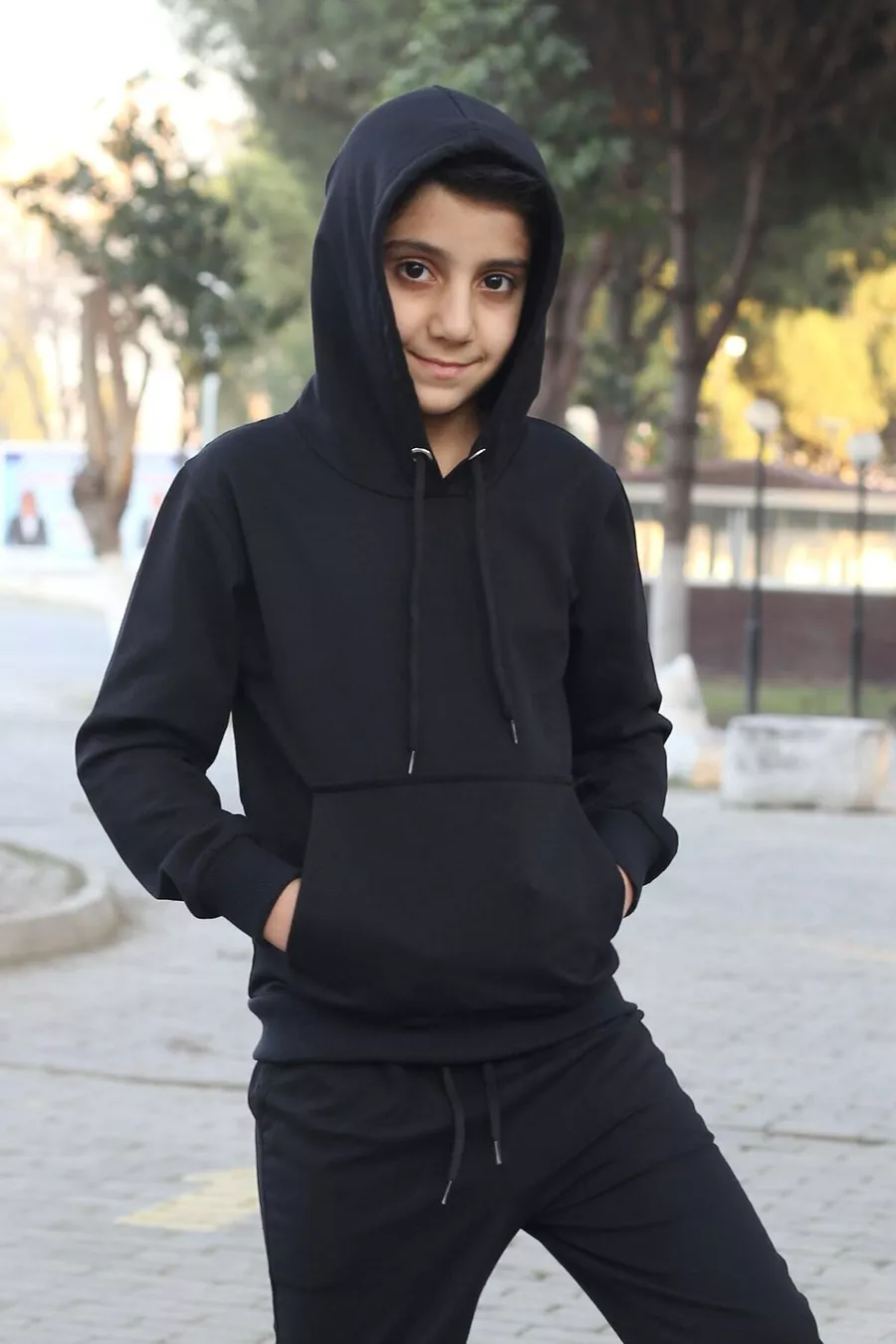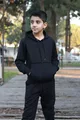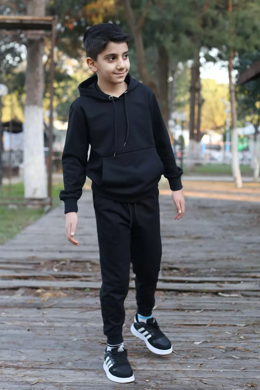 Tuta da bambino maschio a tinta unita con felpa con cappuccio, tasca a marsupio e polsini e vita elasticizzati