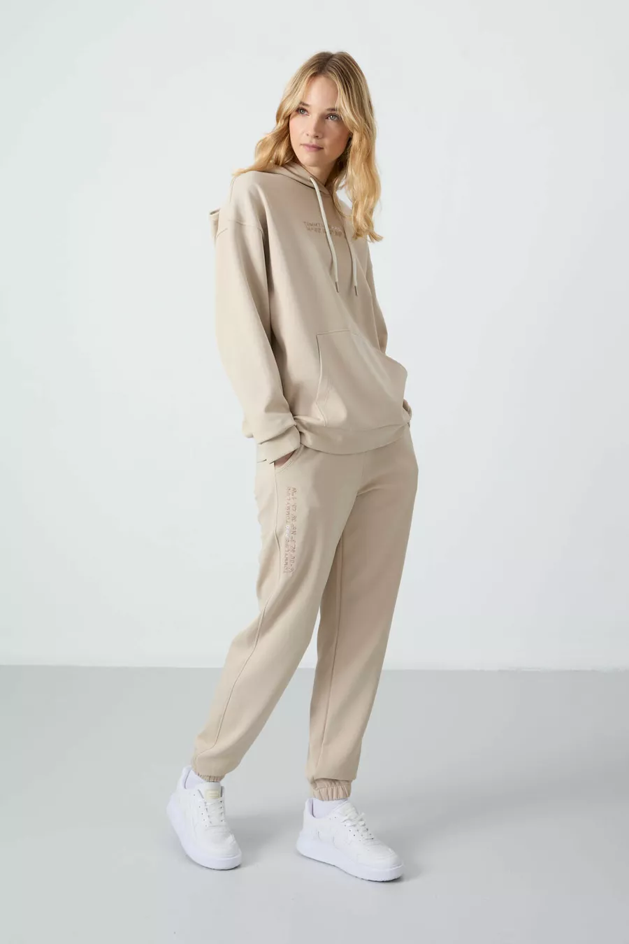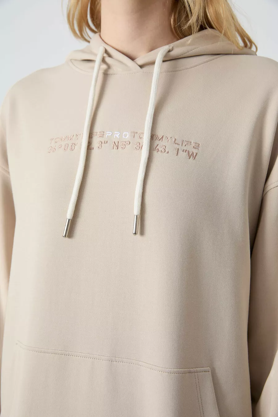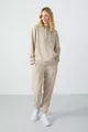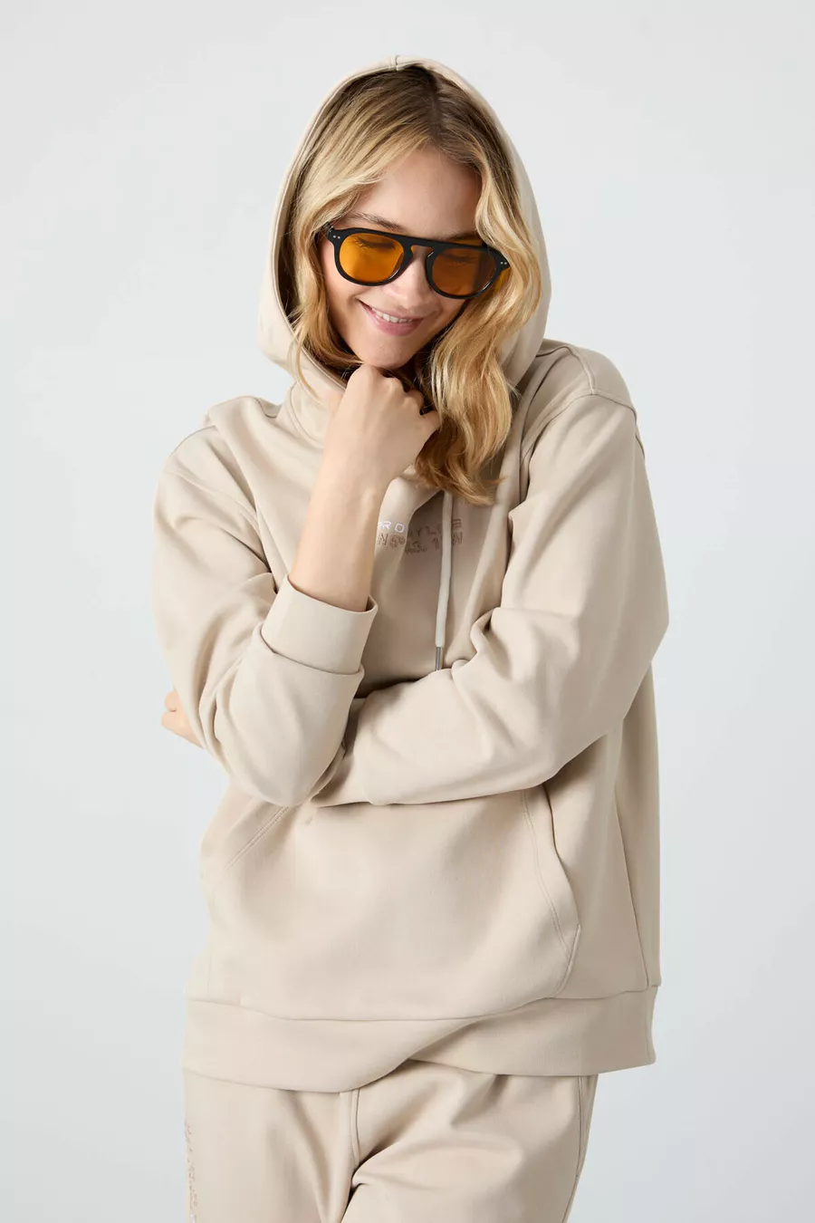 Tuta da donna oversize con cappuccio beige, tasca a marsupio e polsini elasticizzati -