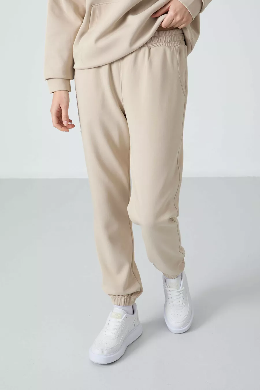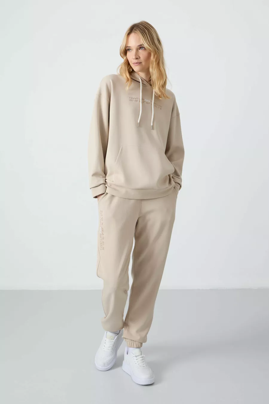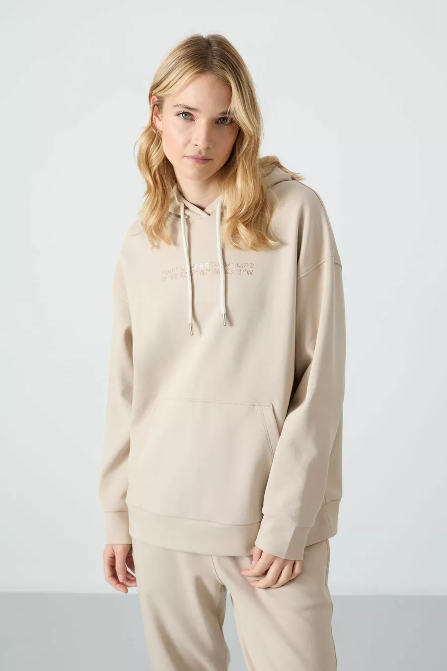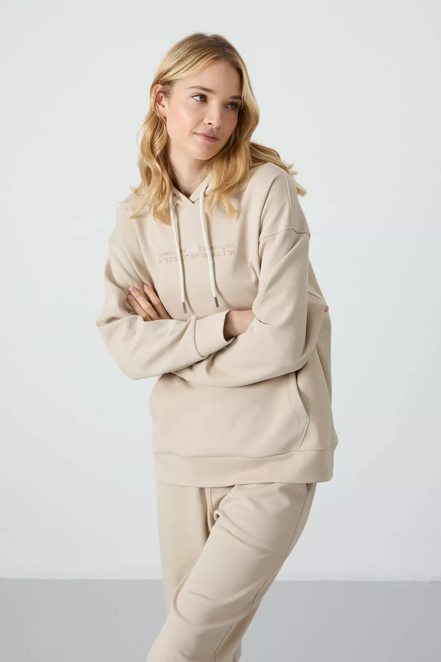 Tuta da donna oversize con cappuccio beige, tasca a marsupio e polsini elasticizzati -