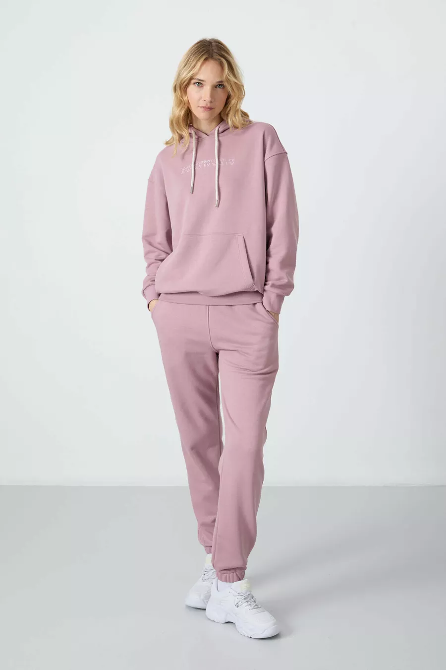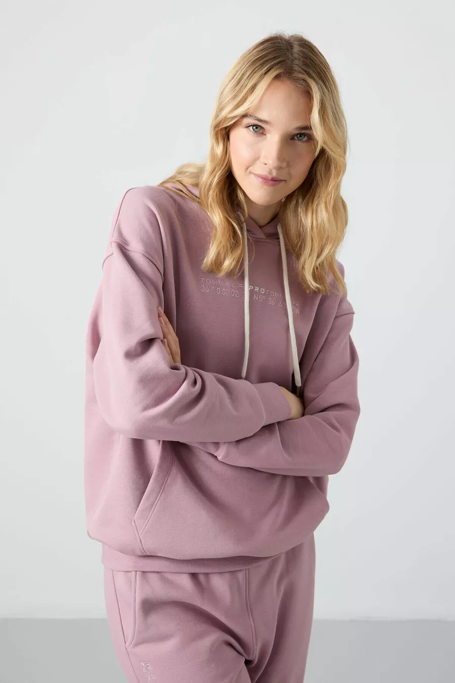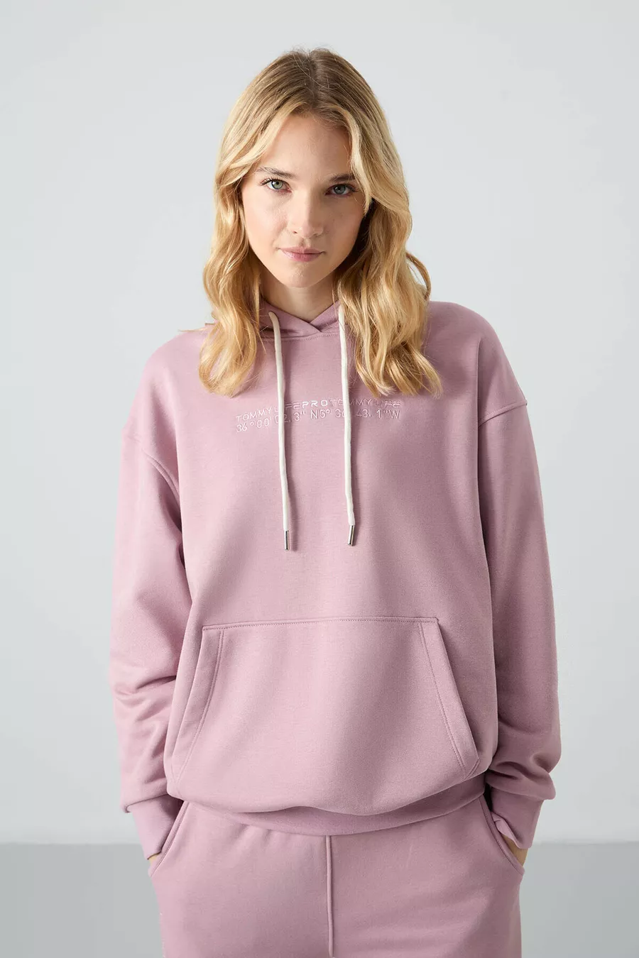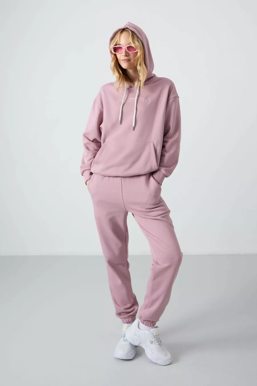 Tuta da donna oversize con cappuccio color rosa antico, tasca a marsupio e polsini elastici -