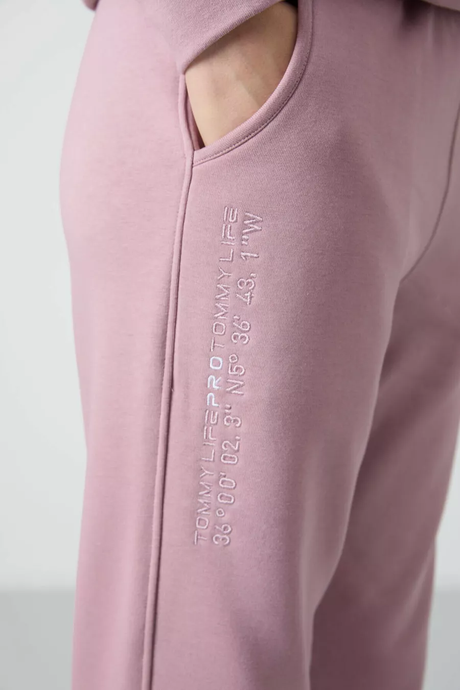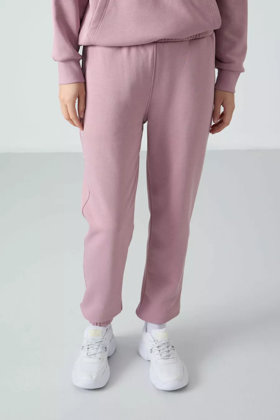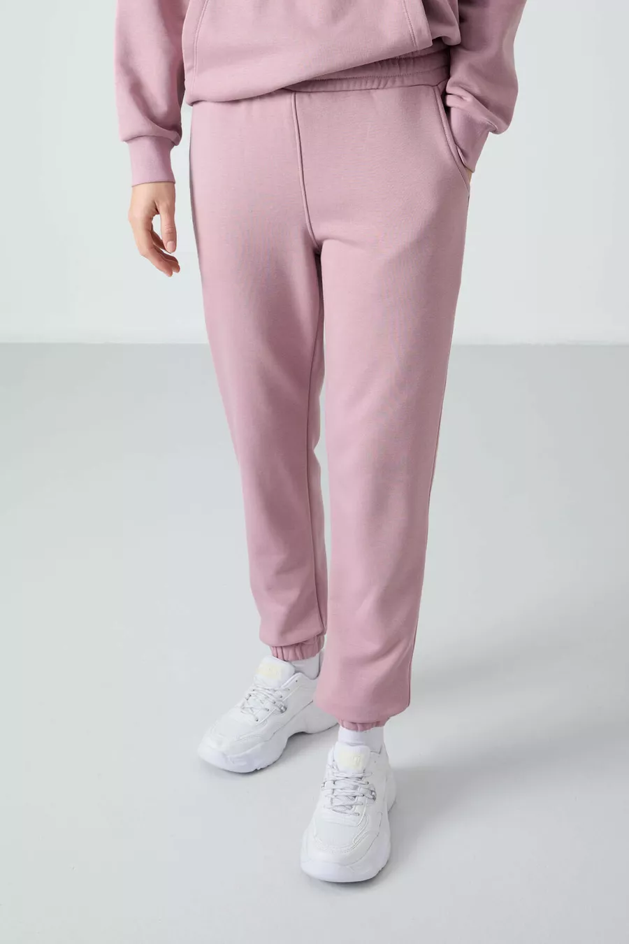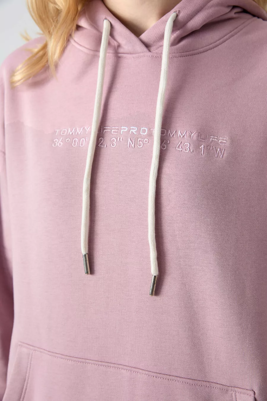 Tuta da donna oversize con cappuccio color rosa antico, tasca a marsupio e polsini elastici -