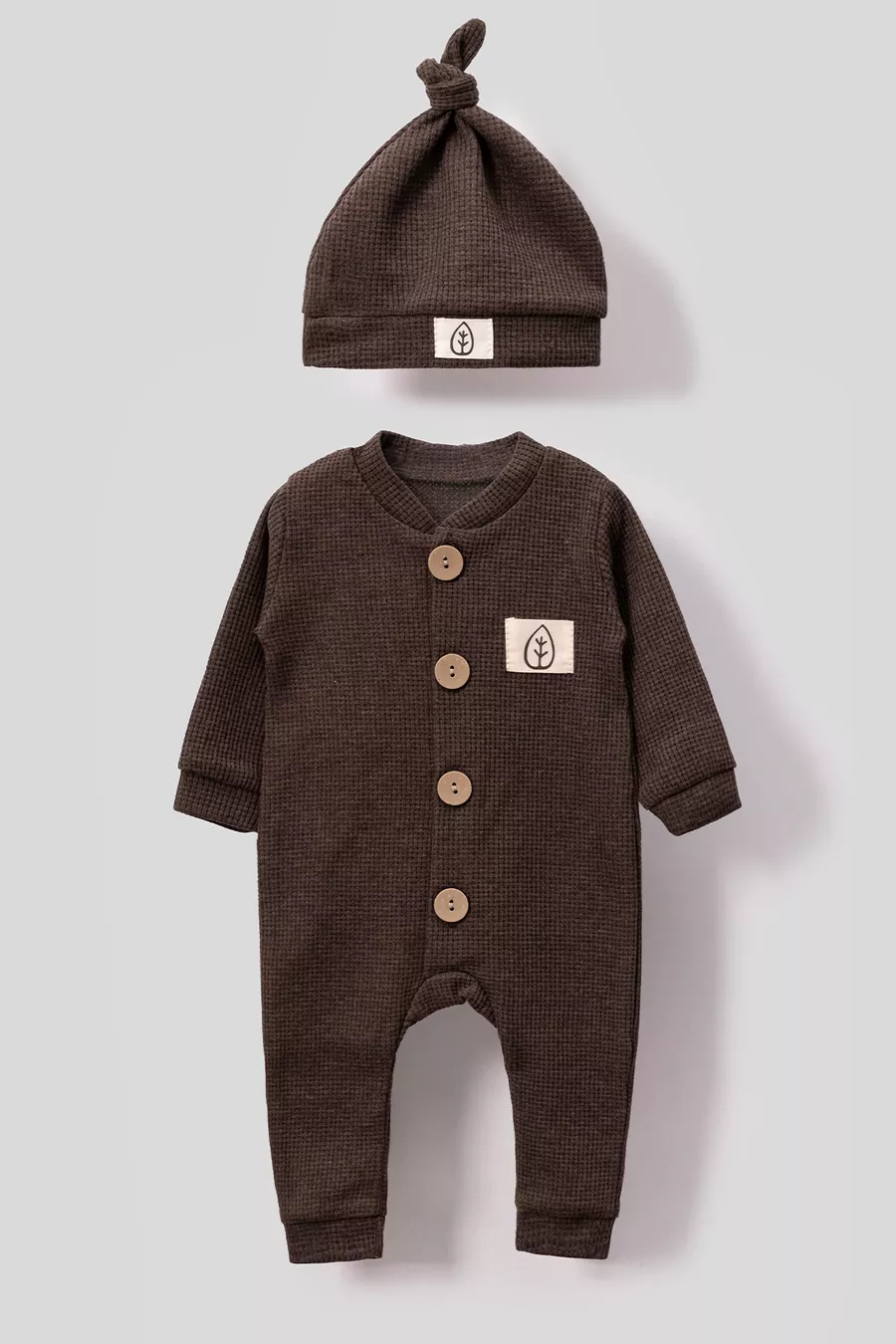 Tuta per neonati elegante unisex con bottoni in legno e cappello a waffle - marrone