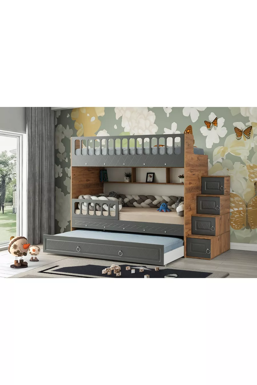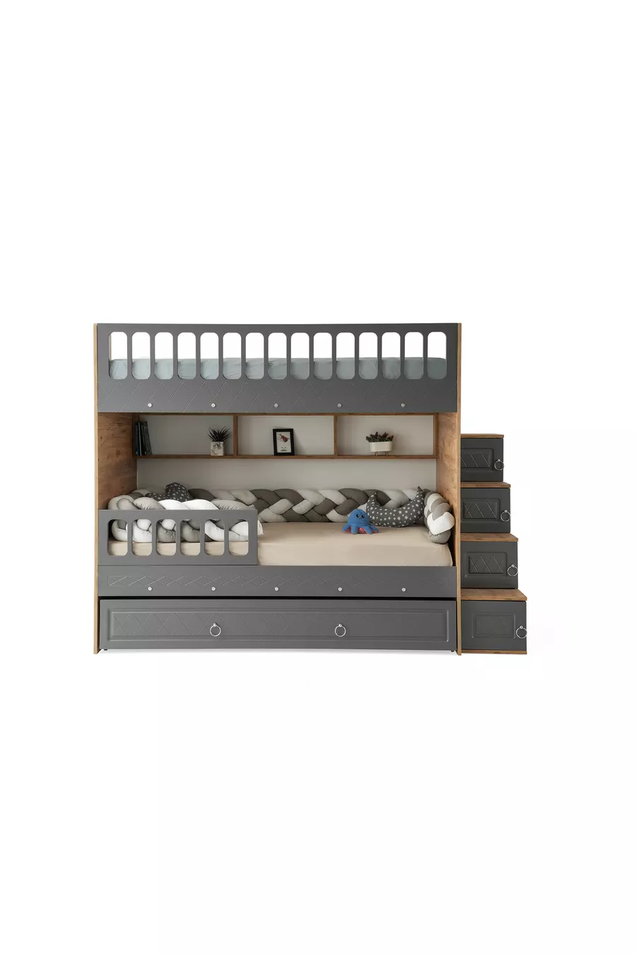 Zümrüt Ranza / Pino-antracite / Installazione Gratuita / 3 Zone Letto e Scala con Armadio / 100% MDF