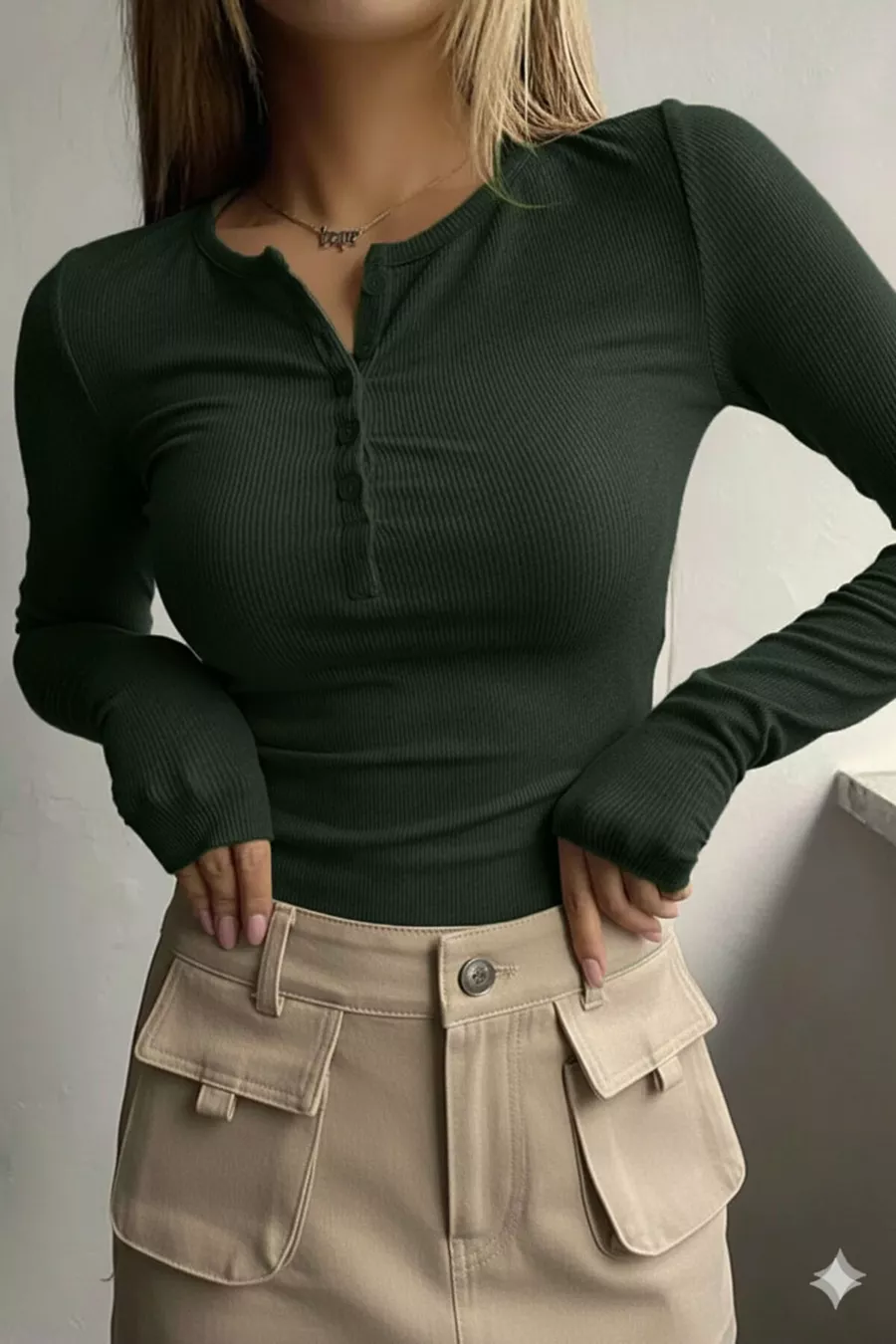 1 Dames kaki groene blouse met knoopdetails, knoopsluiting, ronde hals, lange mouwen en geribbelde ribstof