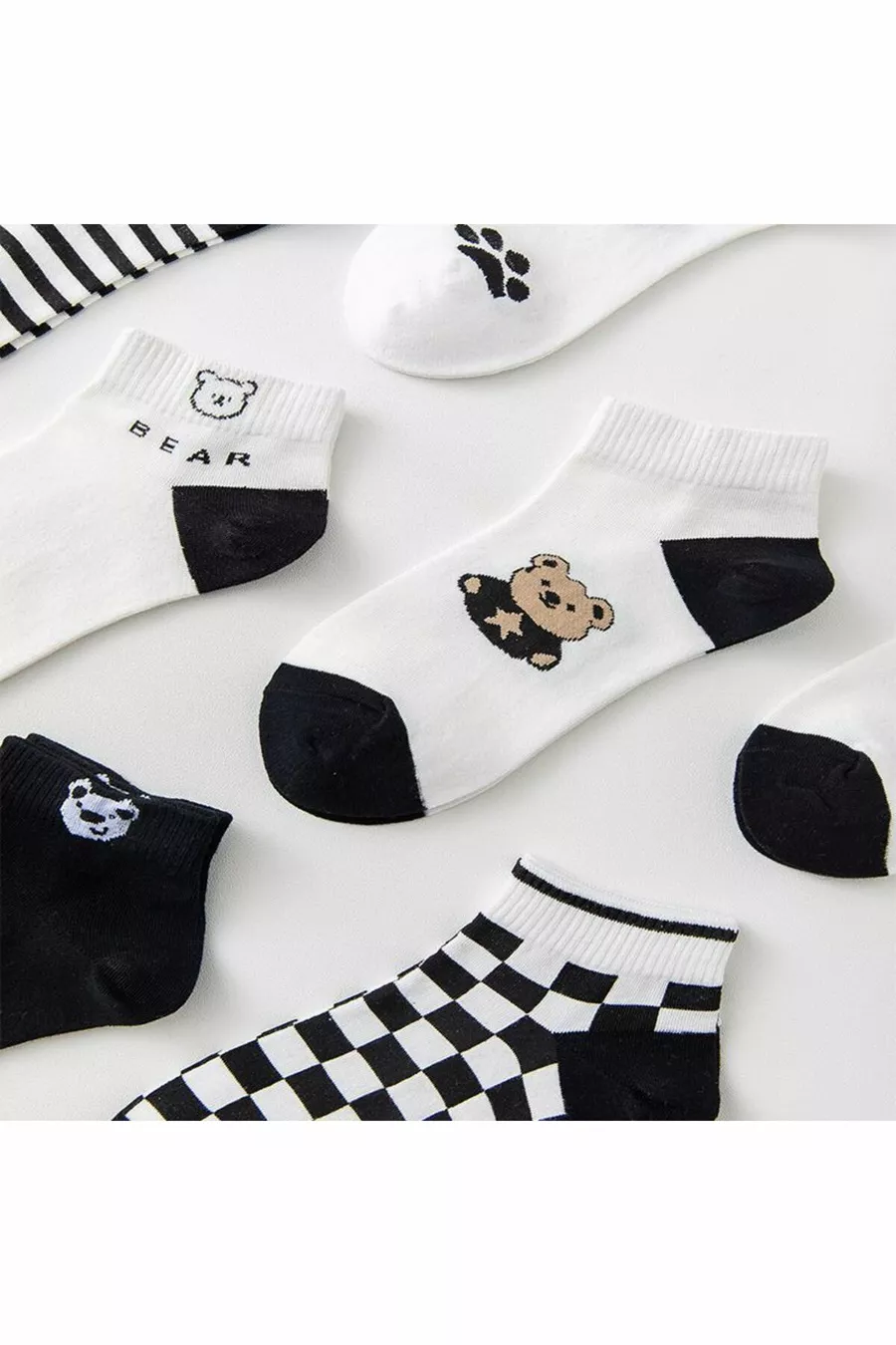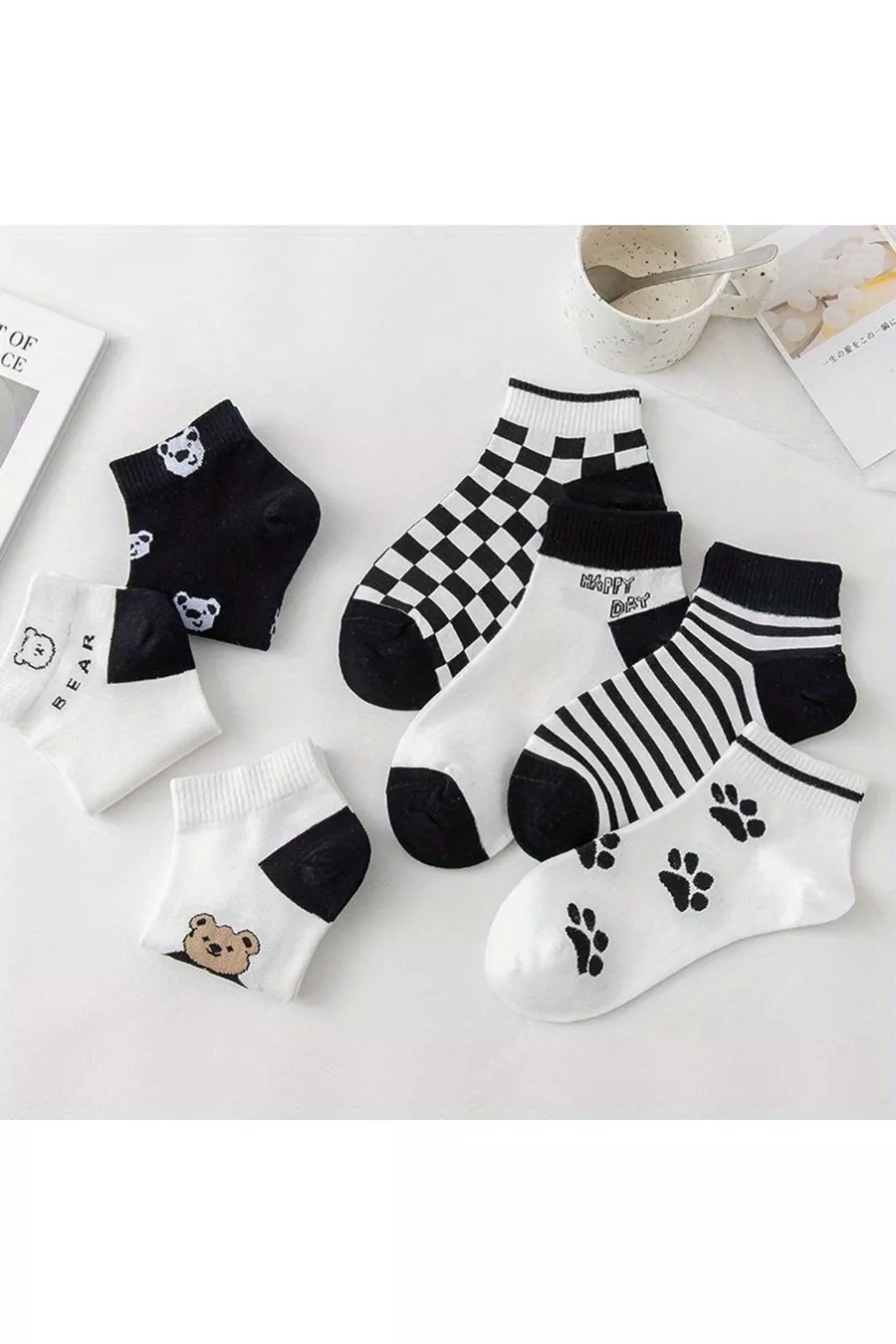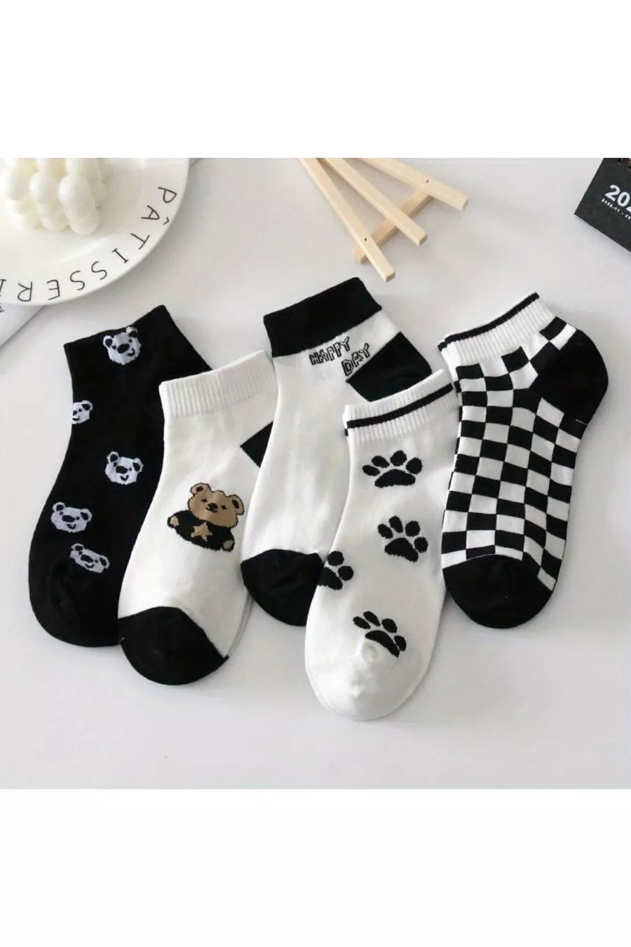 5 Paar Dames Sneakersokken van Katoen met Zwart-Wit Teddy Patroon