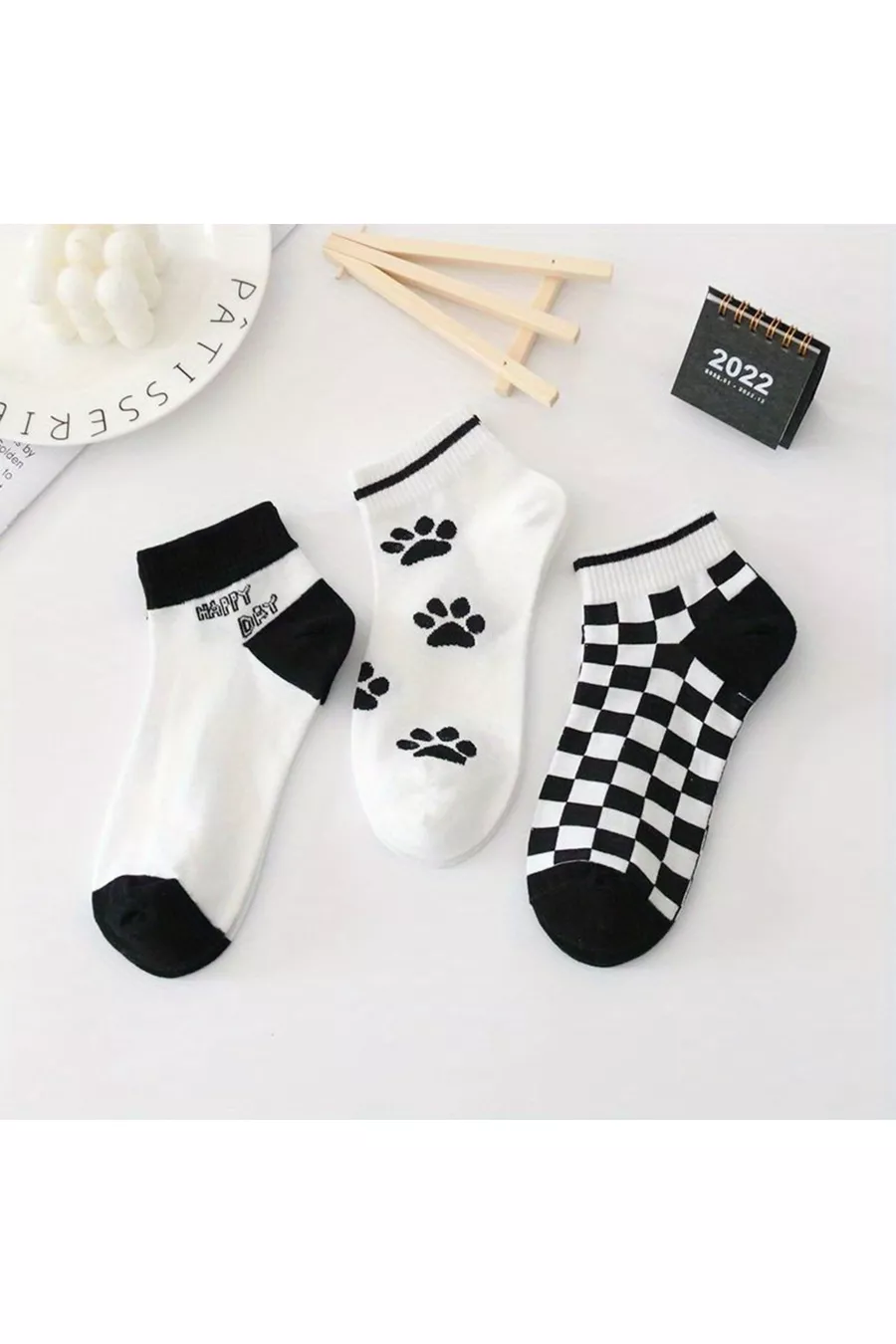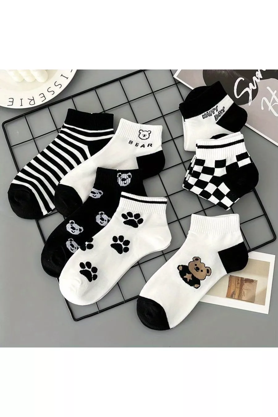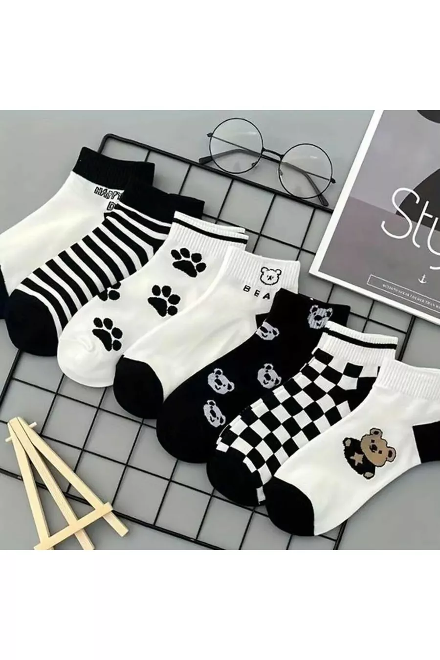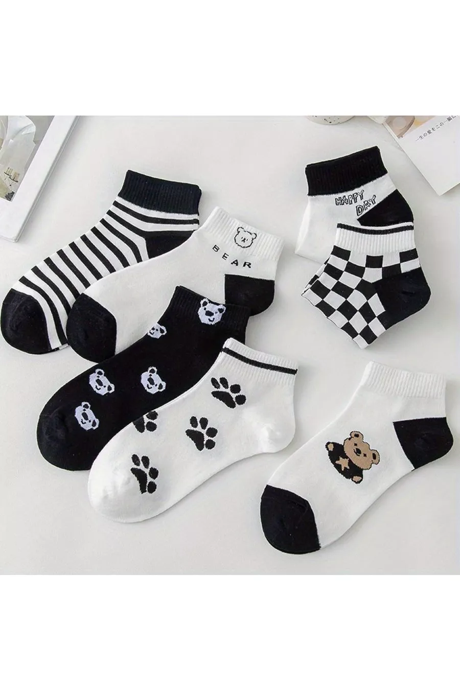 5 Paar Dames Sneakersokken van Katoen met Zwart-Wit Teddy Patroon