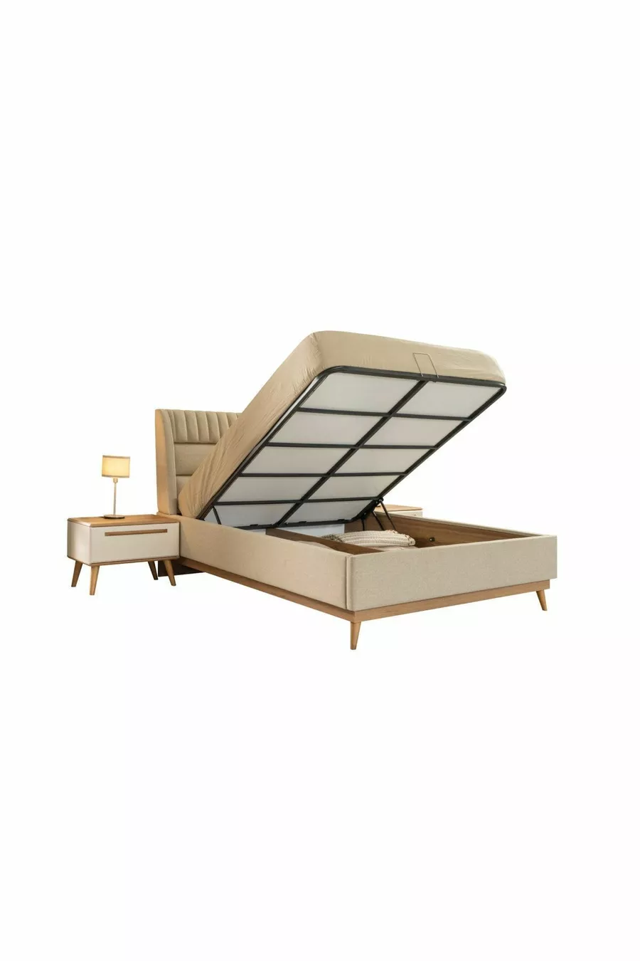 Kleur: Beige Garantieperiode: 2 Jaar Bedfunctie: Met opbergruimte Kastfunctie: Met spiegel Materiaal kastlichaam: Spaanplaat Aantal deuren: 6 Setinhoud: Bed met opbergruimte + 2 nachtkastjes + ladekast + kast Stijl: Modern Kenmerk: Met laden