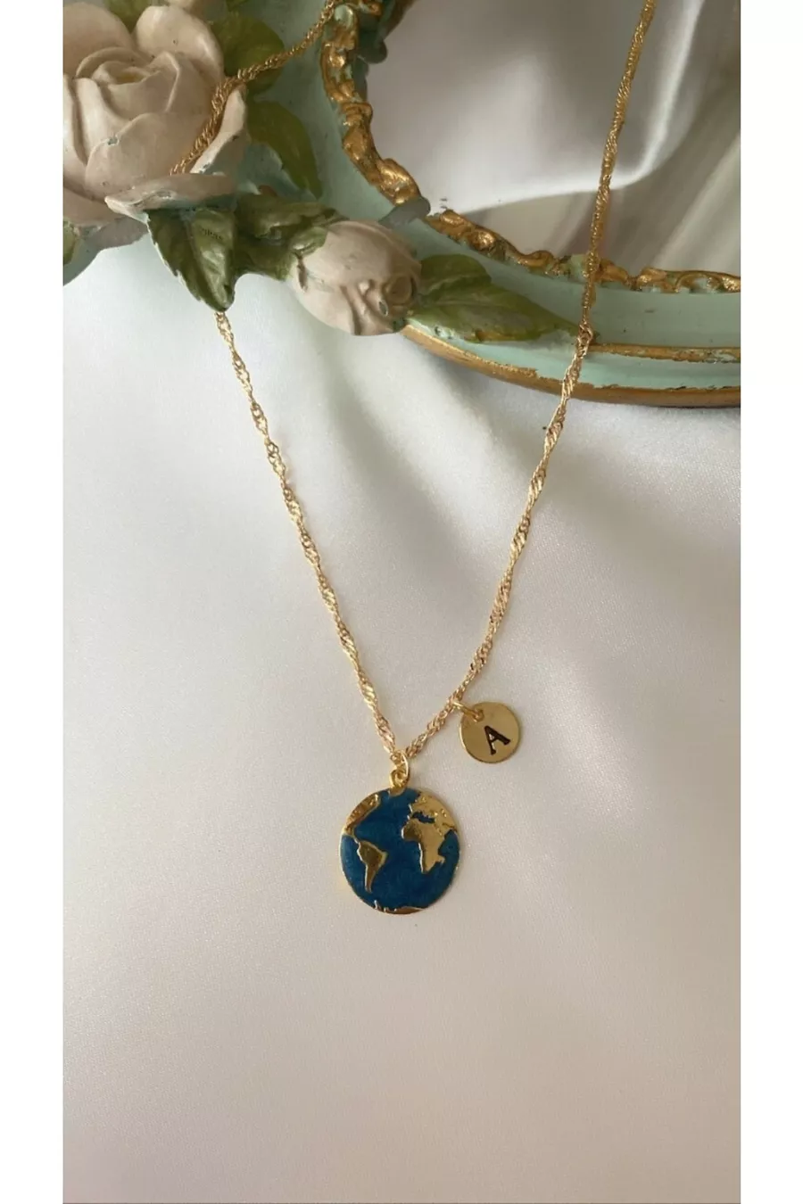 Wereldketting met blauwe emaille en letter A