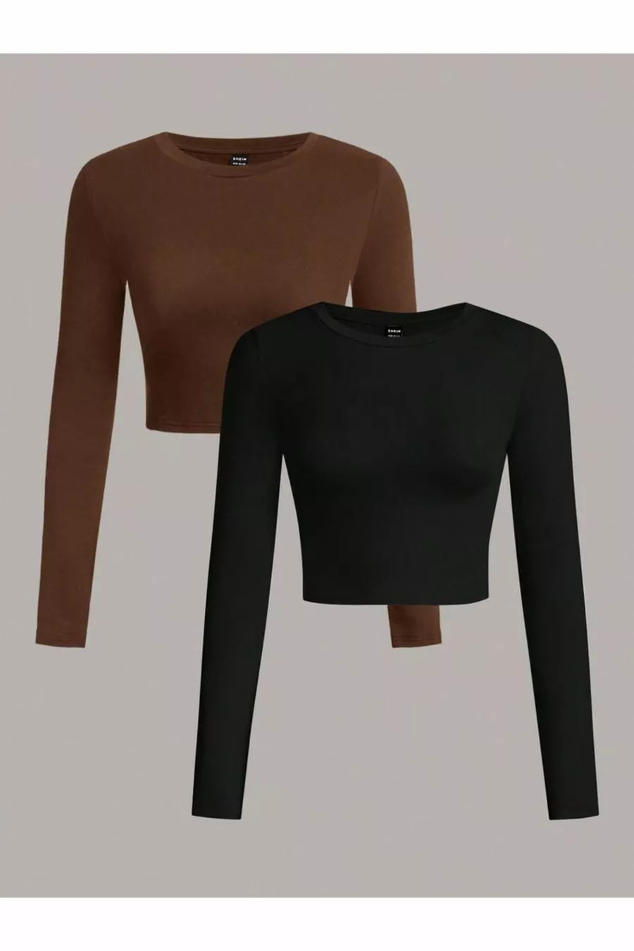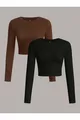 Dames 2 stuks Ribbel % KATOEN Gebreide Langarm Crop Top met Ronde Hals