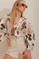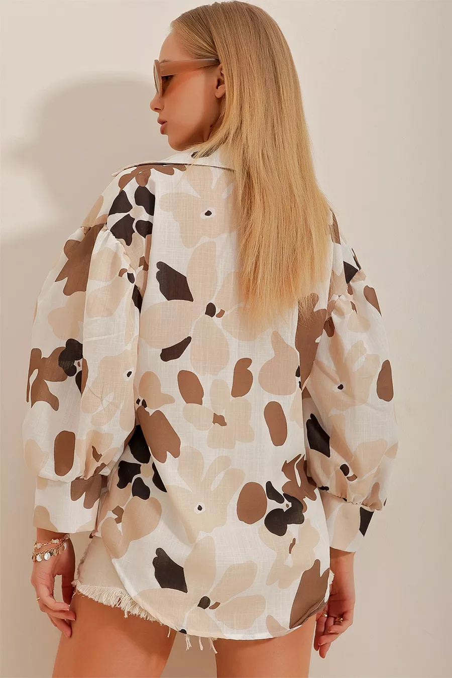 Dames Beige Prinses Etnisch Patroon Geplooide Linnen Geweven Blouse