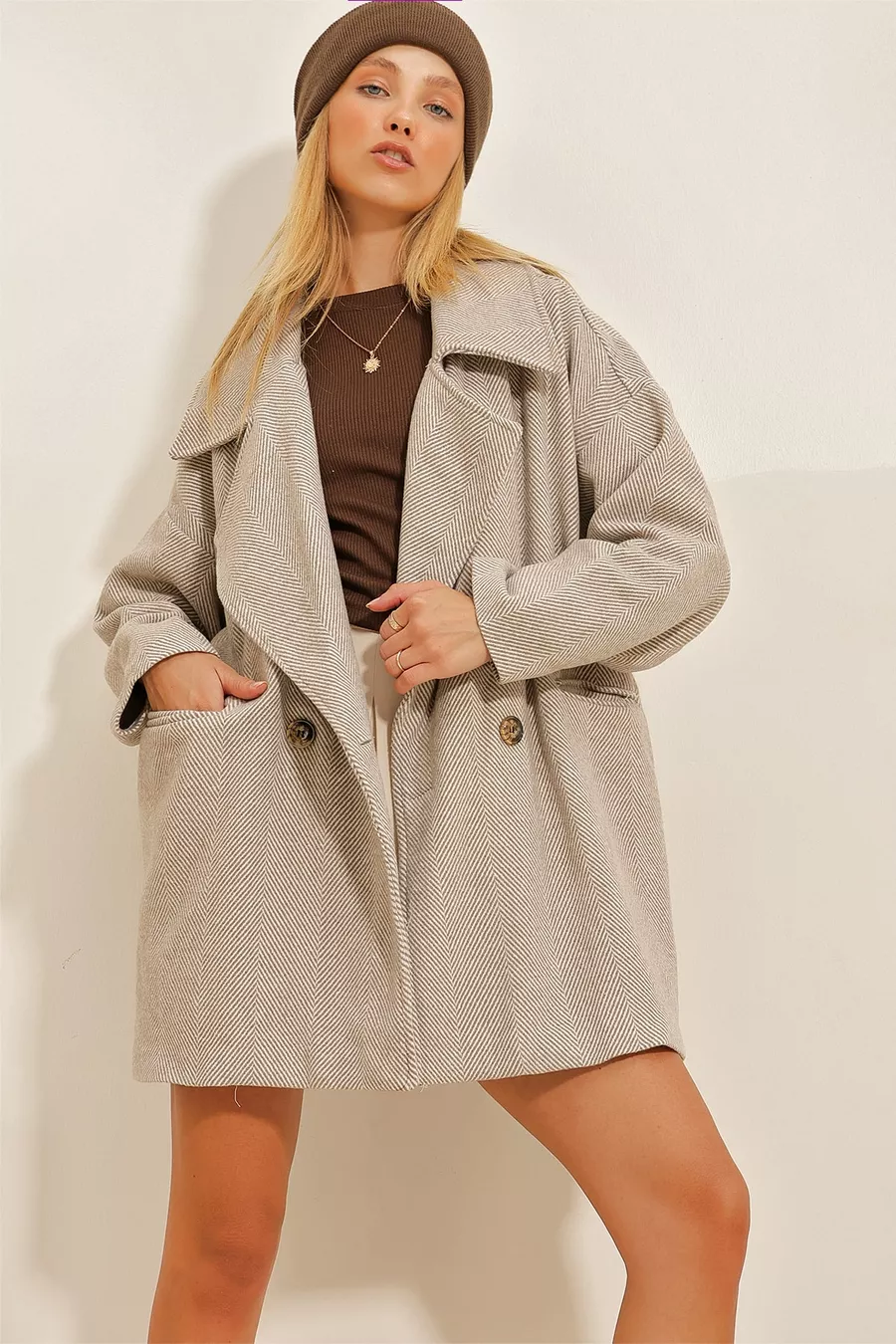 Dames Beige Double-Breasted V-hals Visgraatpatroon Wolmix Jas met Zak