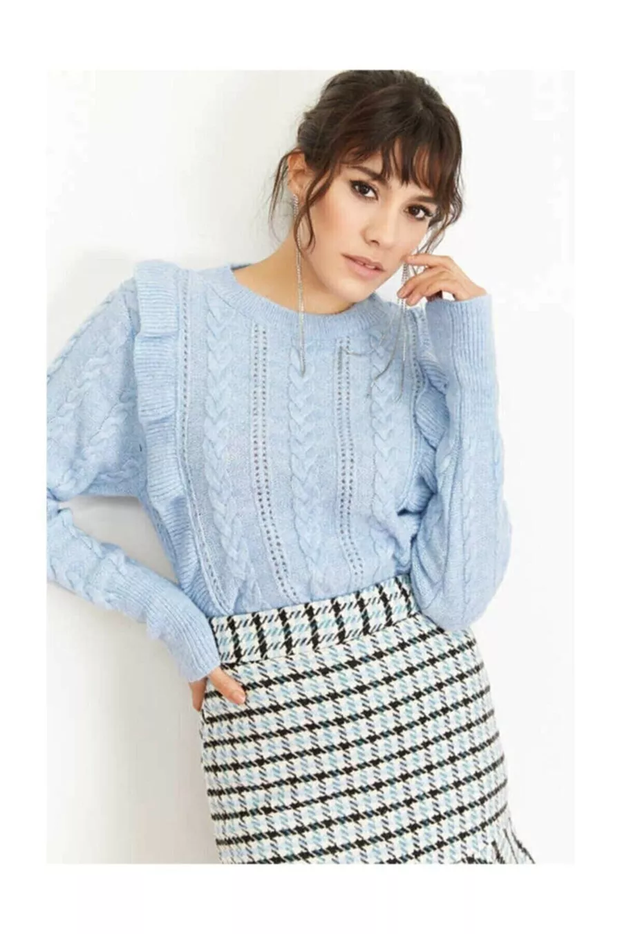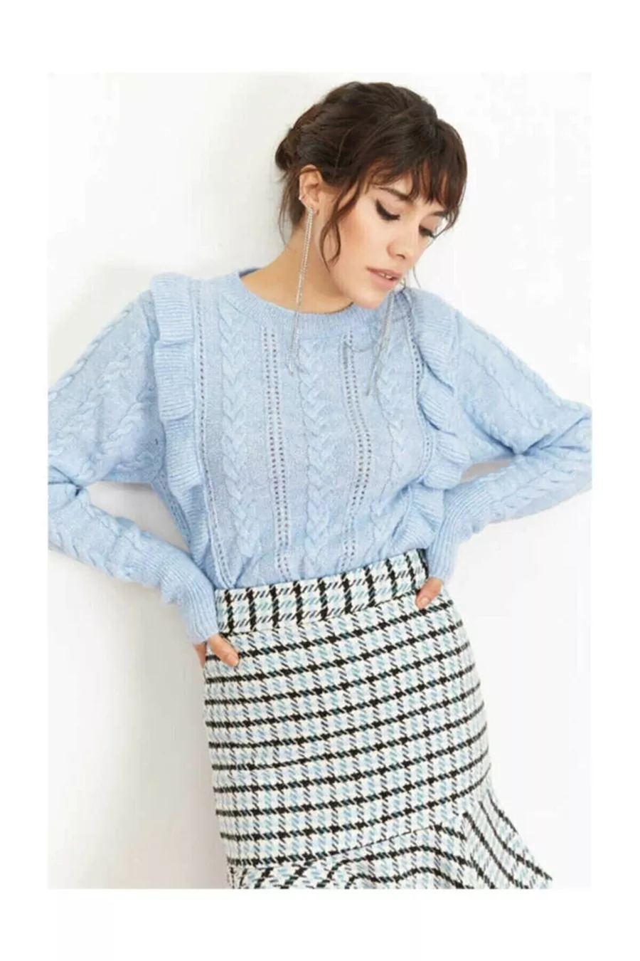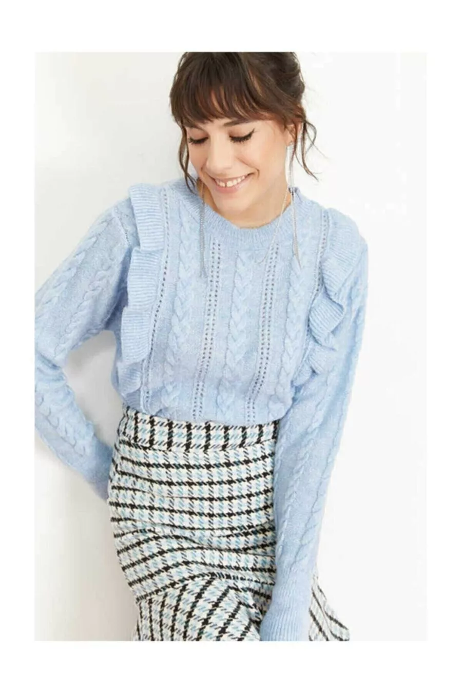 Dames blauw ajour met ruches trui