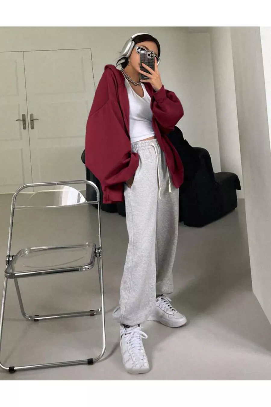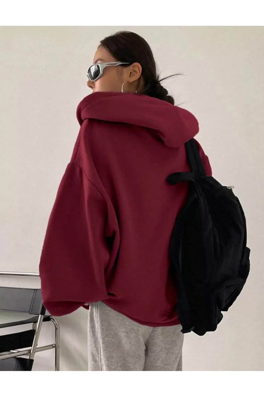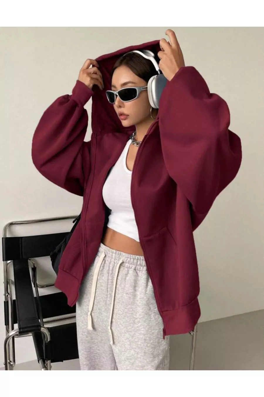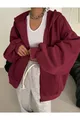 Dames bordeaux vest met capuchon, ritssluiting en ballonmouwen