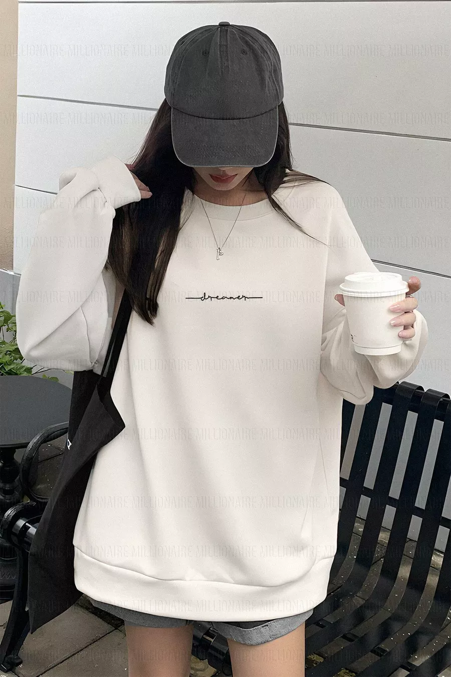 Dames Gebroken Wit Creme Ecru Dreamer Print 0 Ronde Hals Oversized Losvallend Wijd Fitting Fleece Sweatshirt