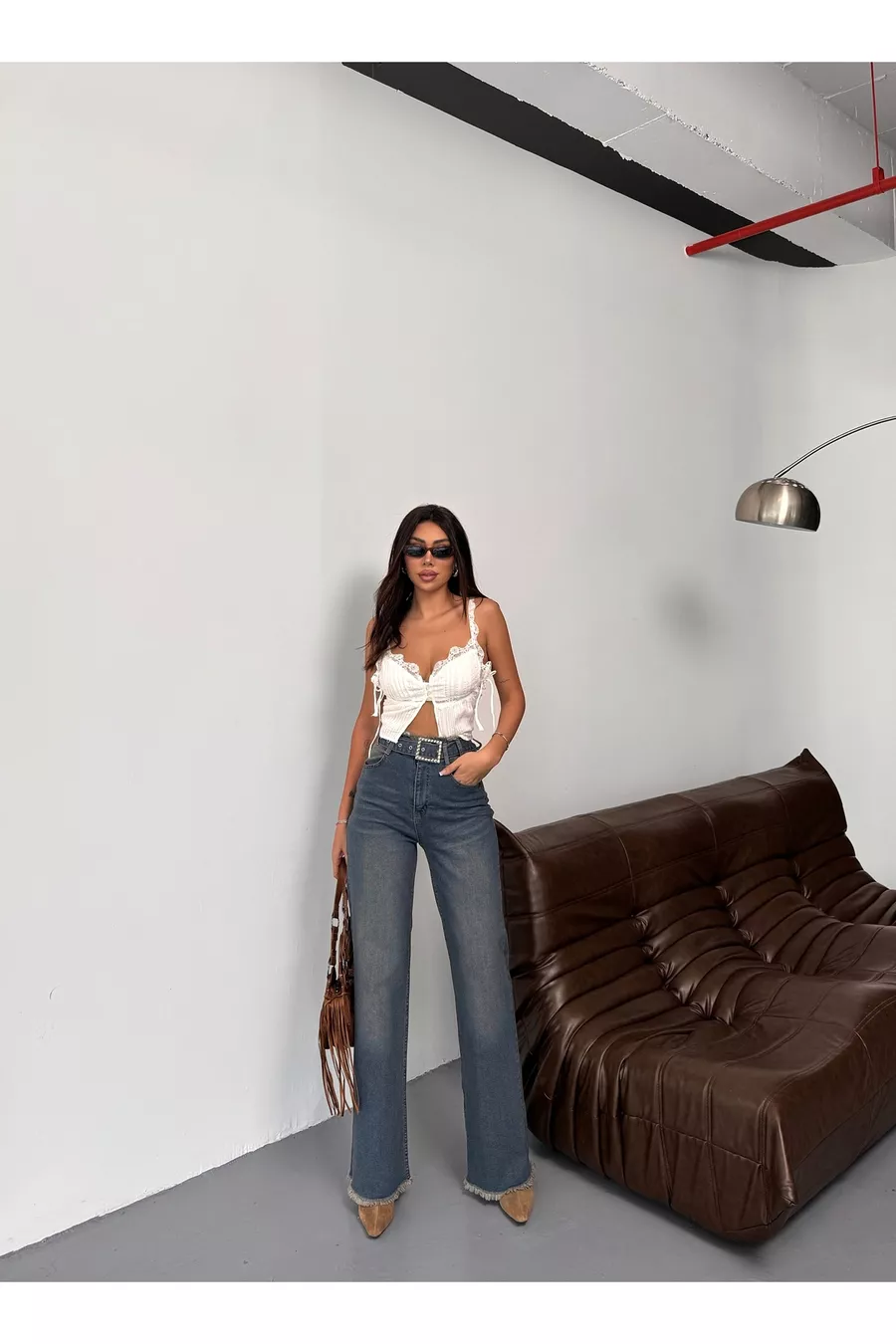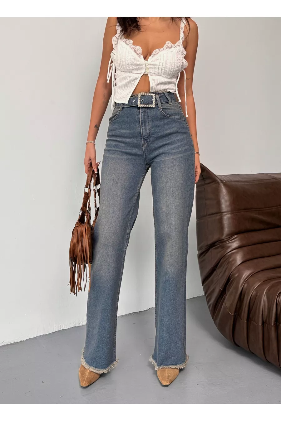 Dames Hoge Taille Bleek Effect Vintage Jeans met Riem, Taille en Zoom Kwastjes Palazzo