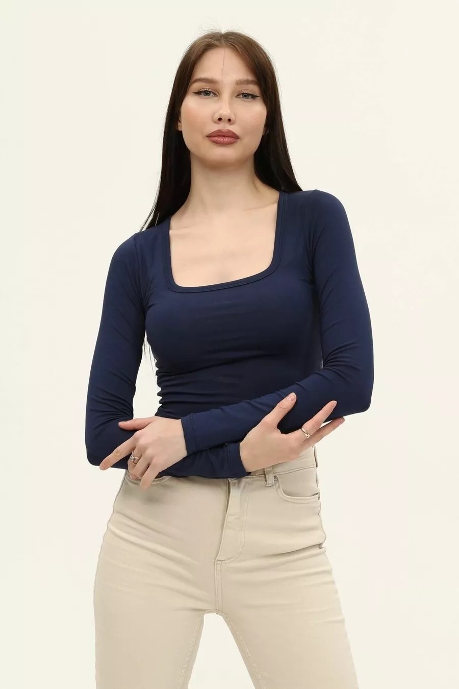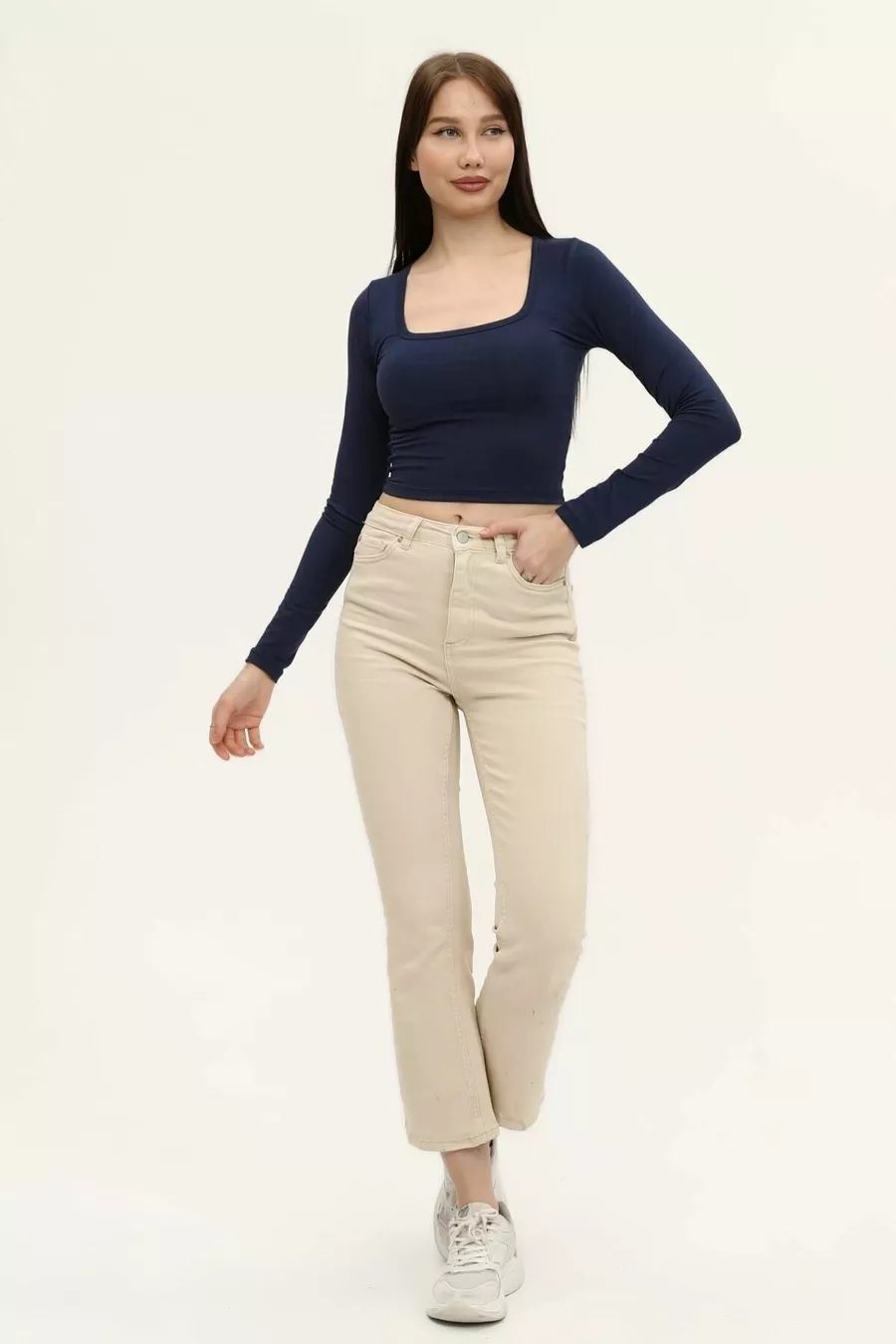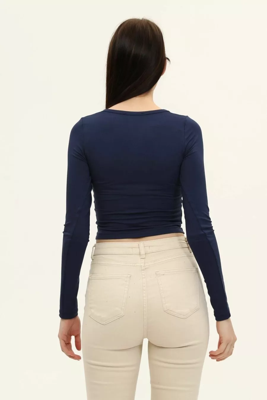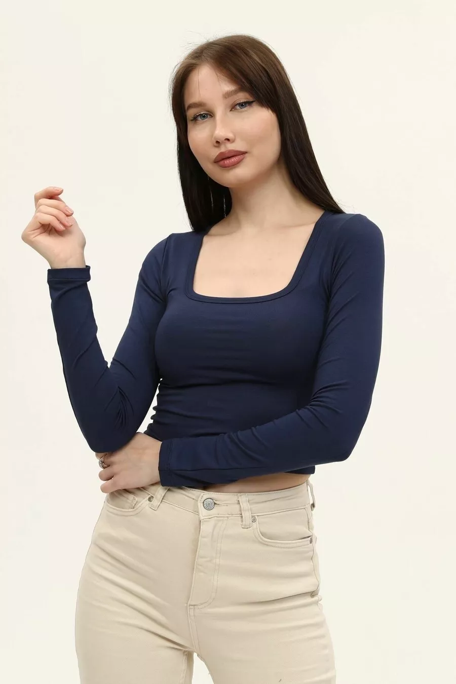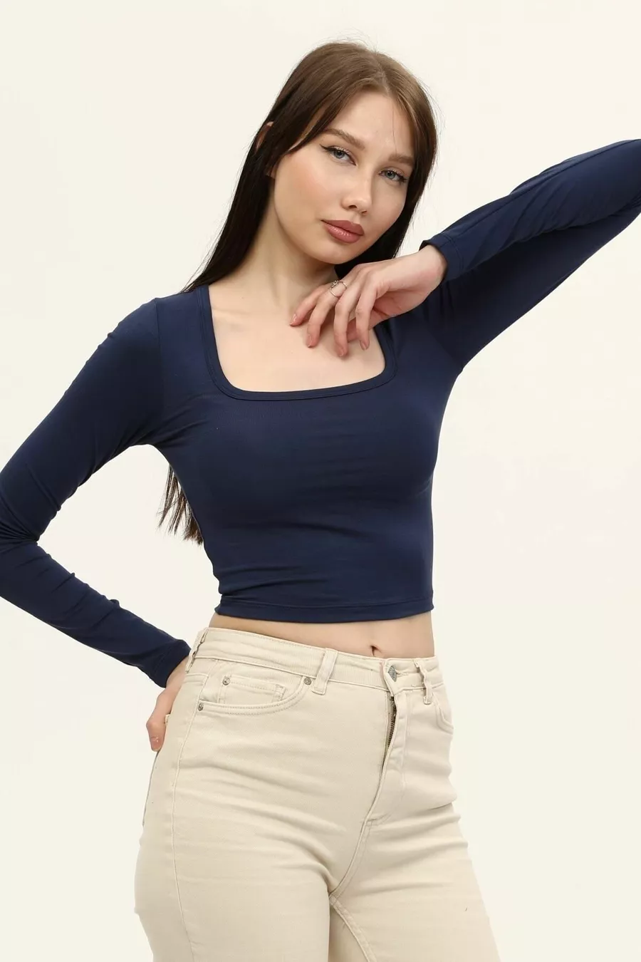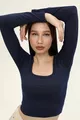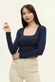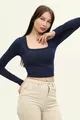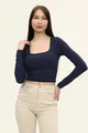 Dames Indigo Blauwe Vierkante Hals Lange Mouwen Croptop Blouse