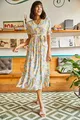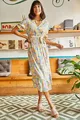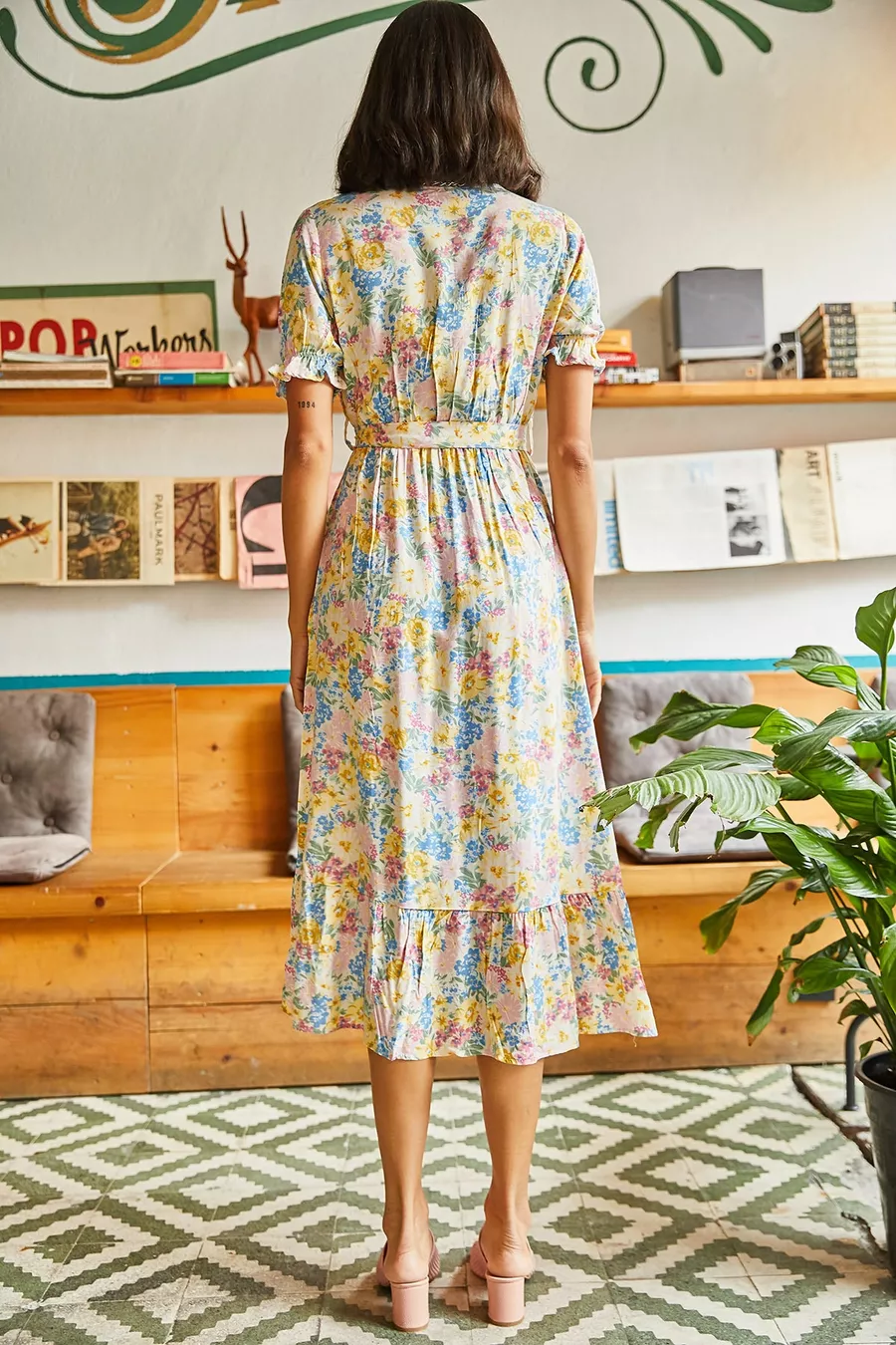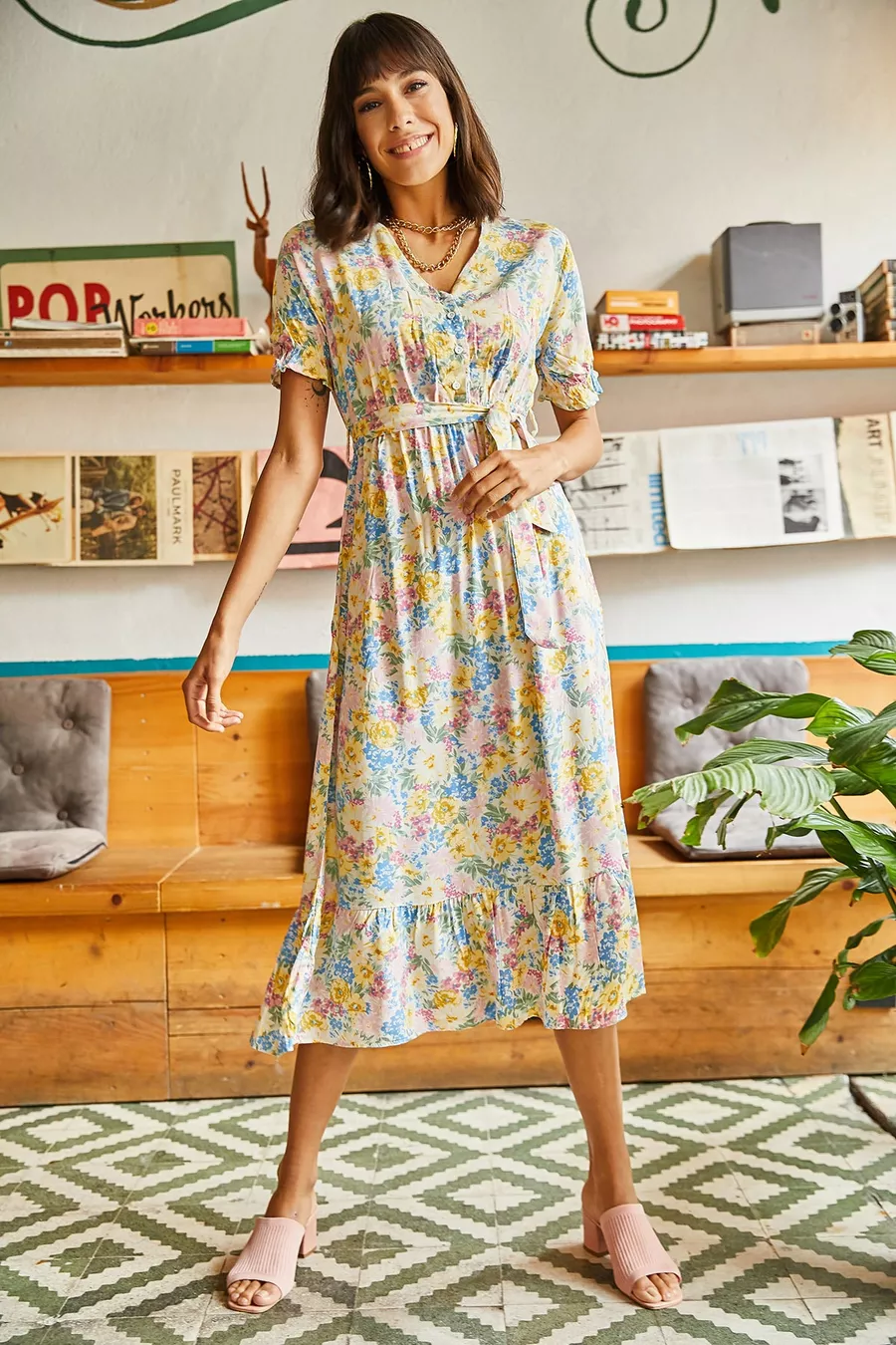 Dames Jurk van geweven viscose met gele knopen en ceintuur, met mouwdetail