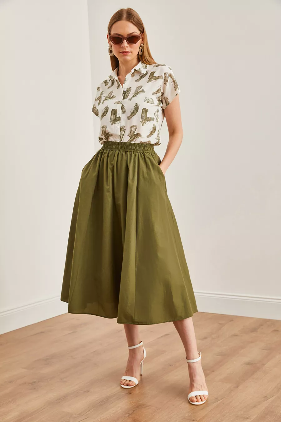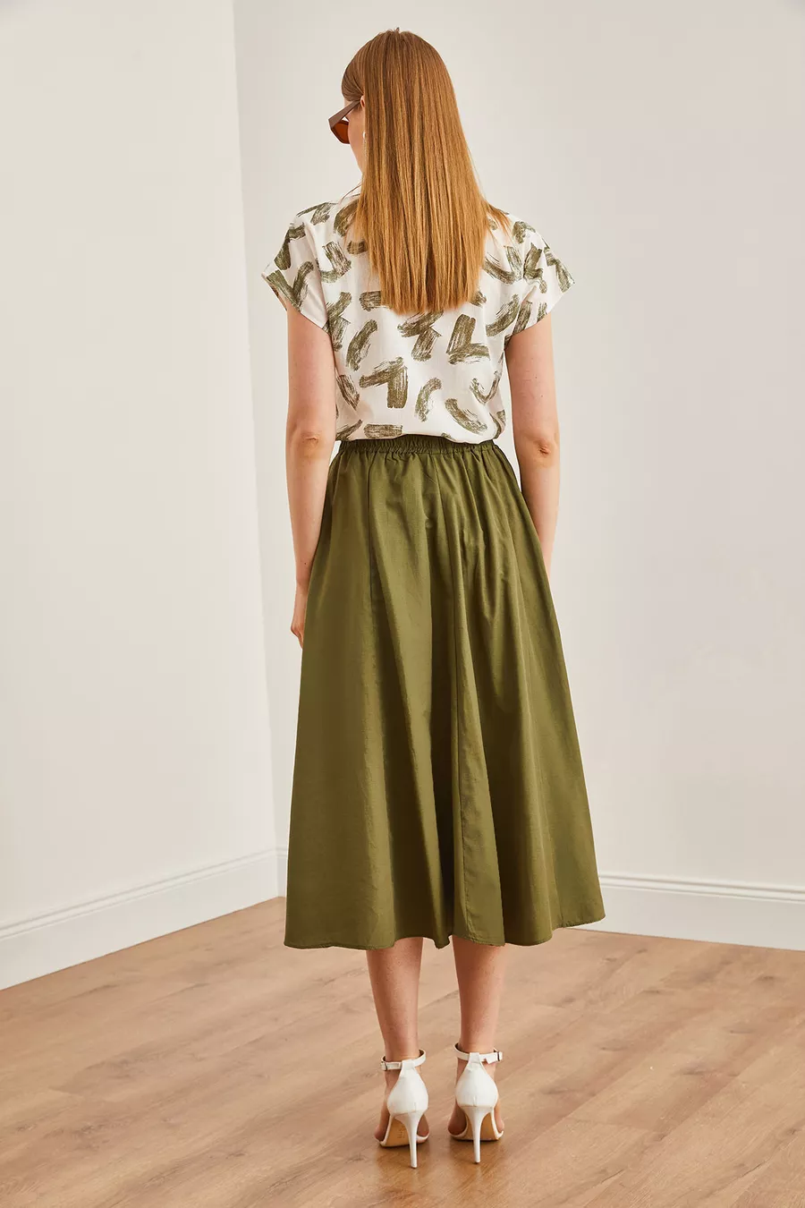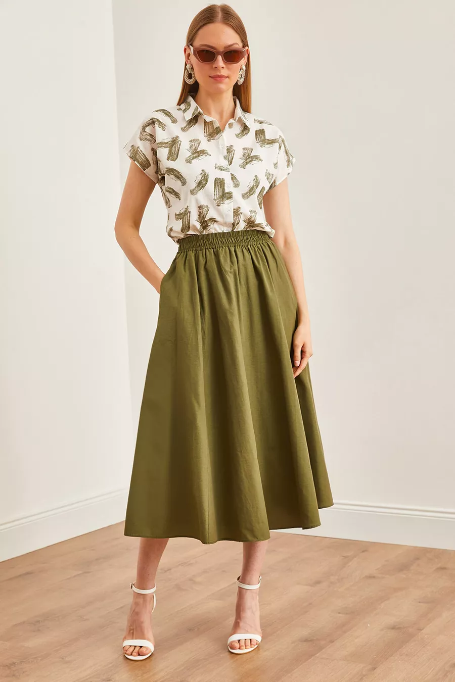 Dames midi geweven klokrok met elastische taille en kaki zakken