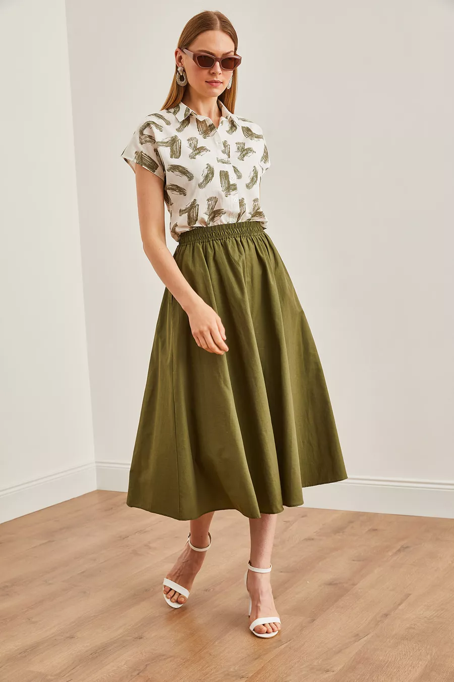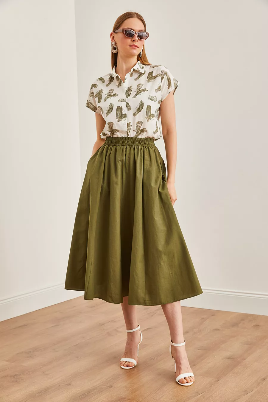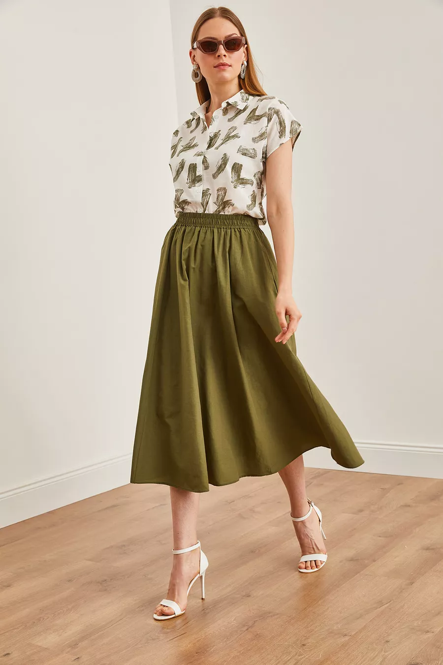 Dames midi geweven klokrok met elastische taille en kaki zakken
