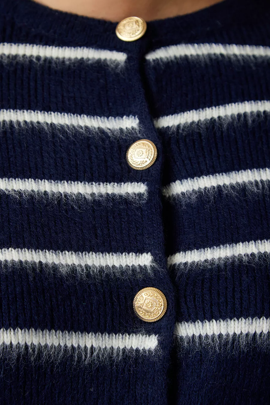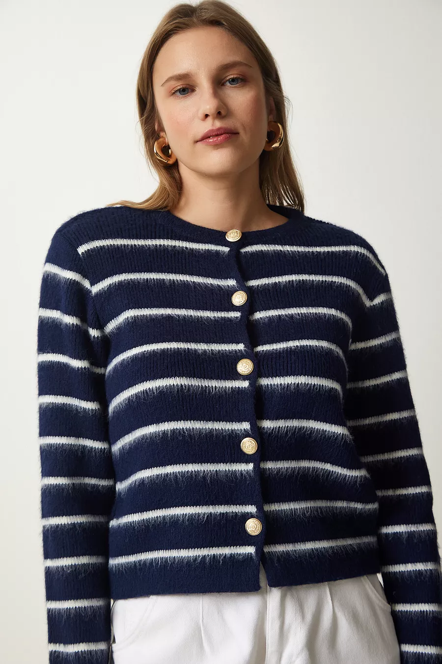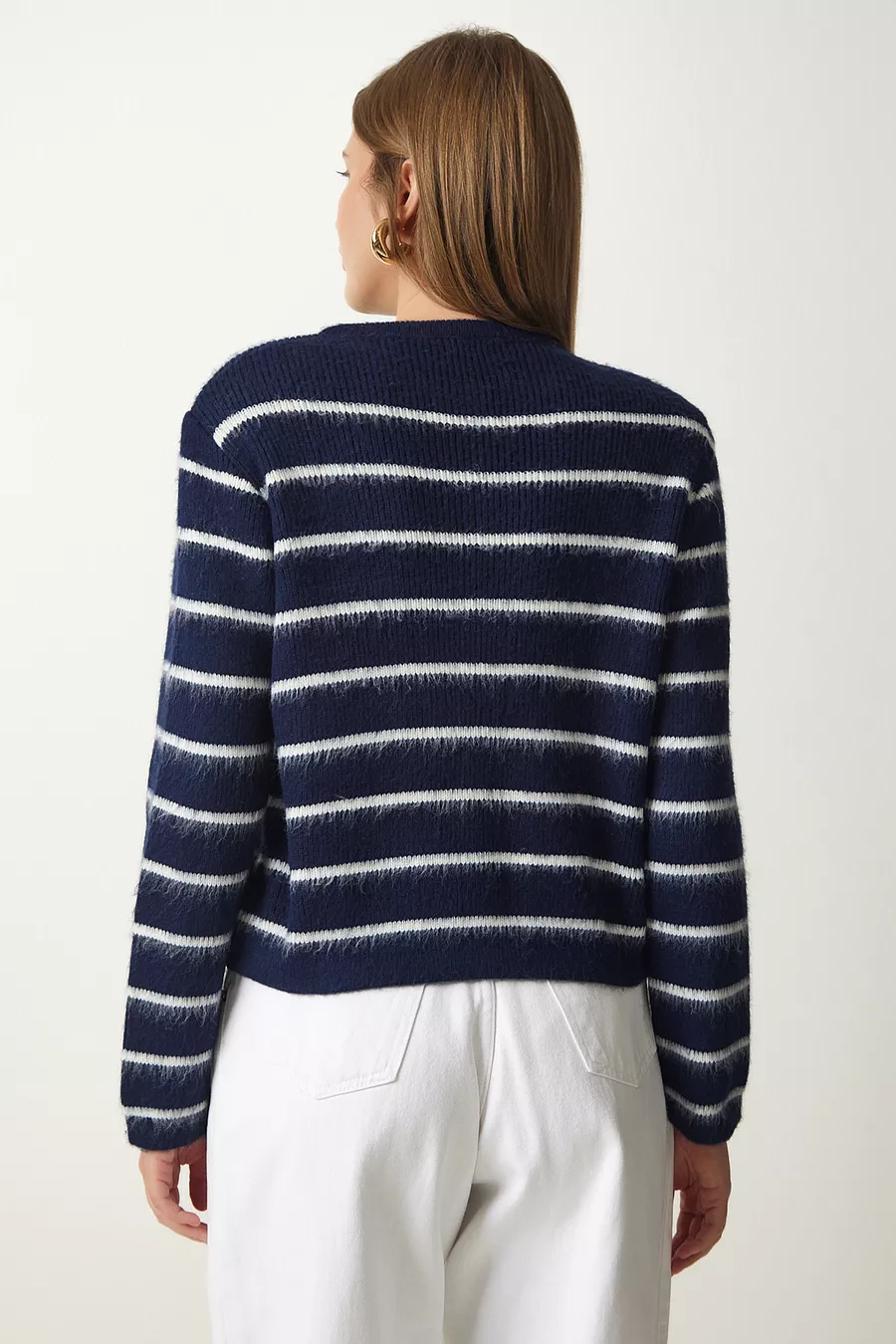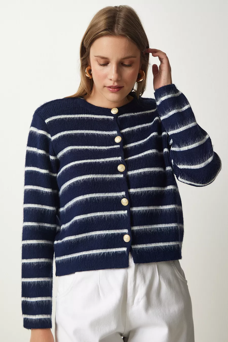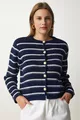 Dames Navy Wit Stijlvolle Gestreepte Trui Met Knopen