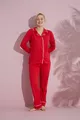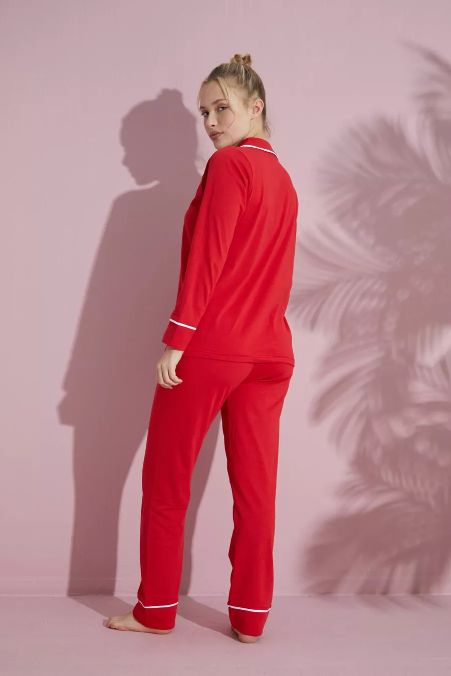 Dames Rode Lange Mouwen Katoenen Pyjama Set met Knopen en Bies
