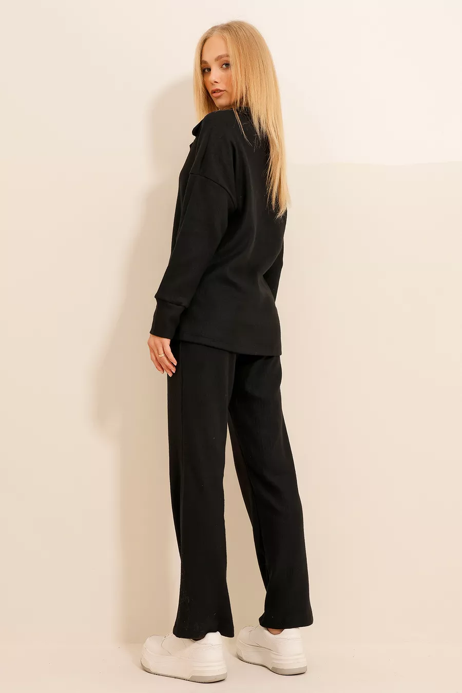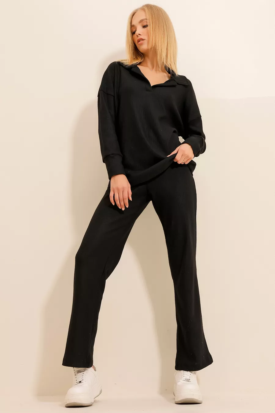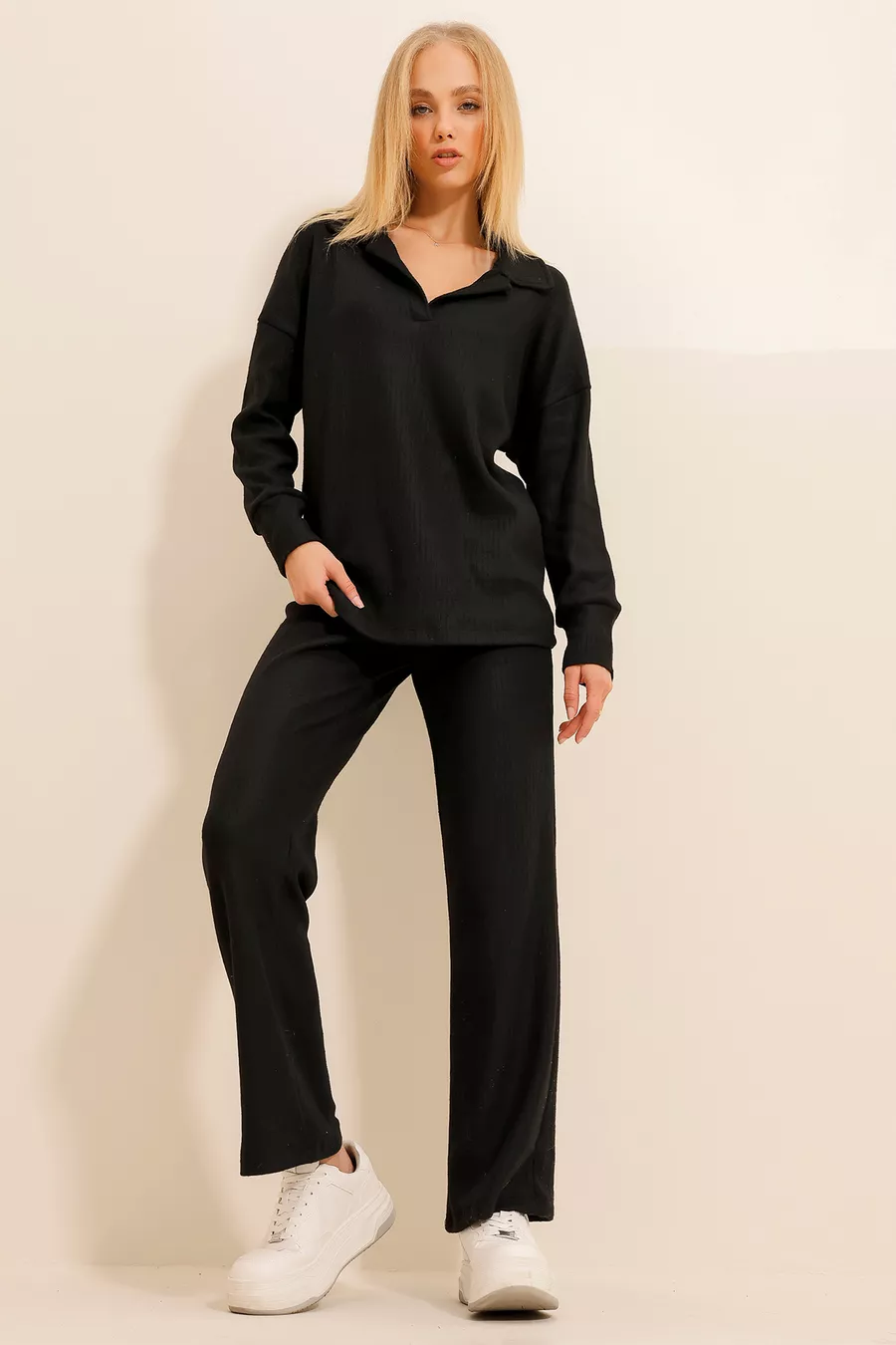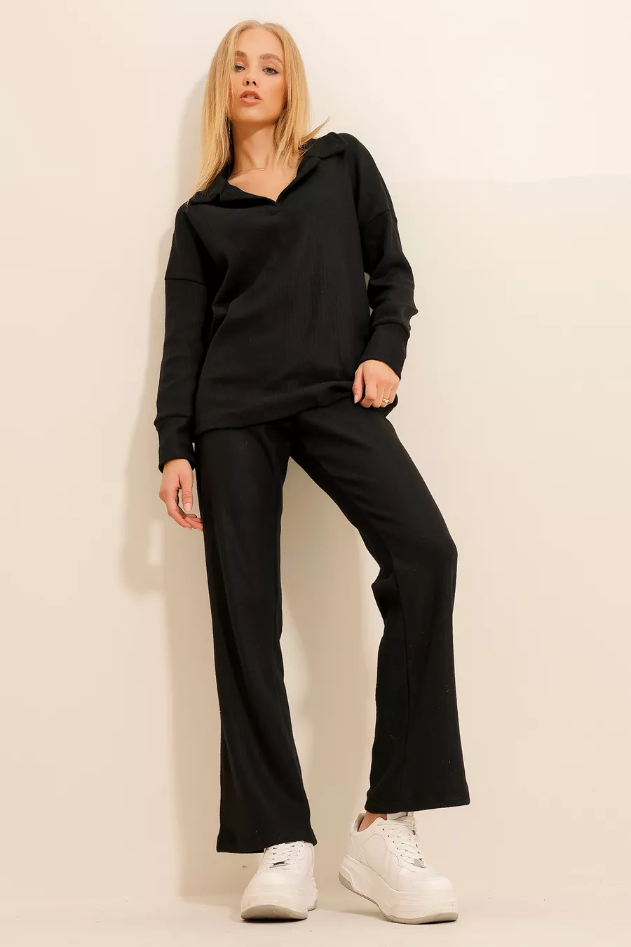 Dames Zwart Polokraag Trui en Palazzobroek Trui Set
