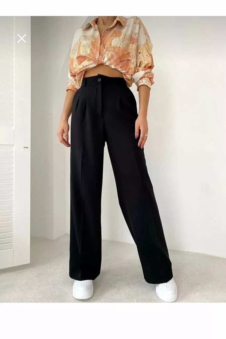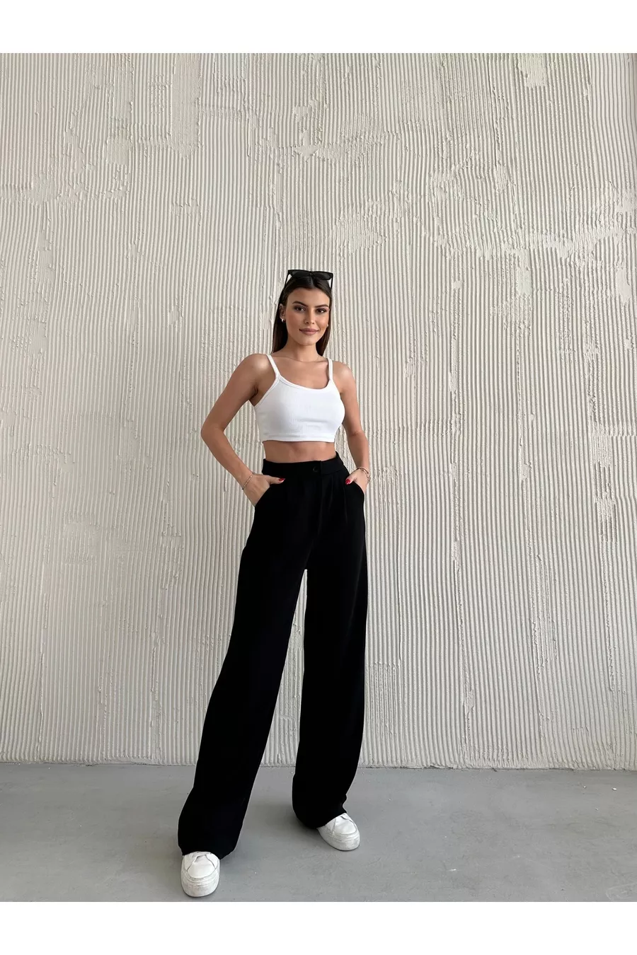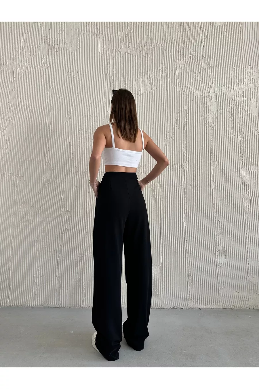 Dames zwarte hoge taille plissé palazzo broek met lycra