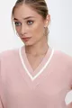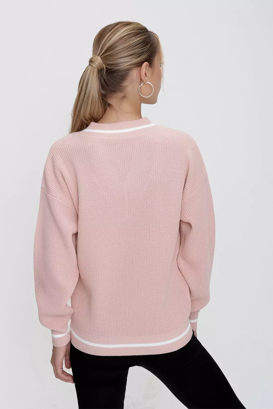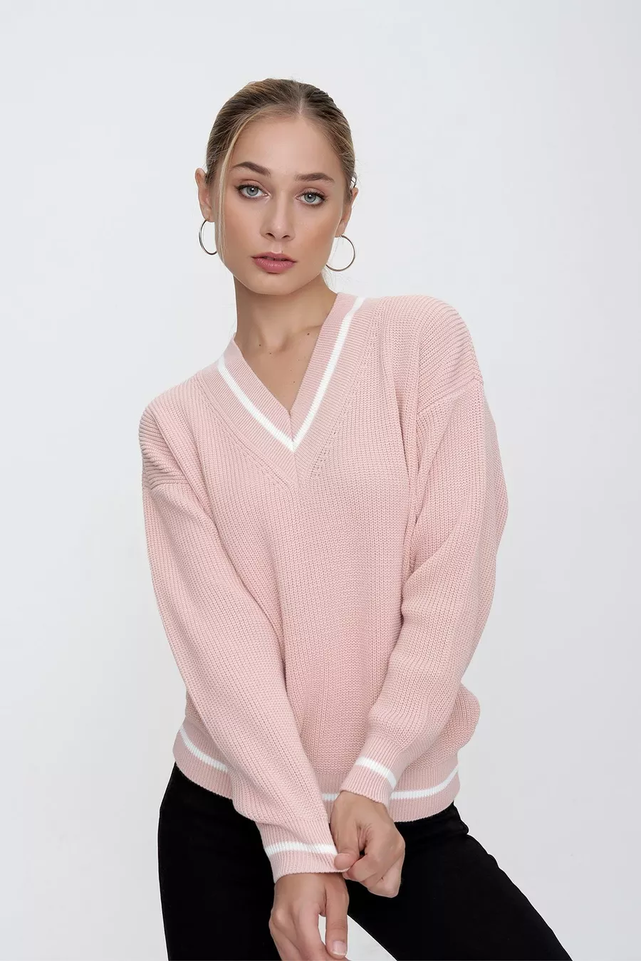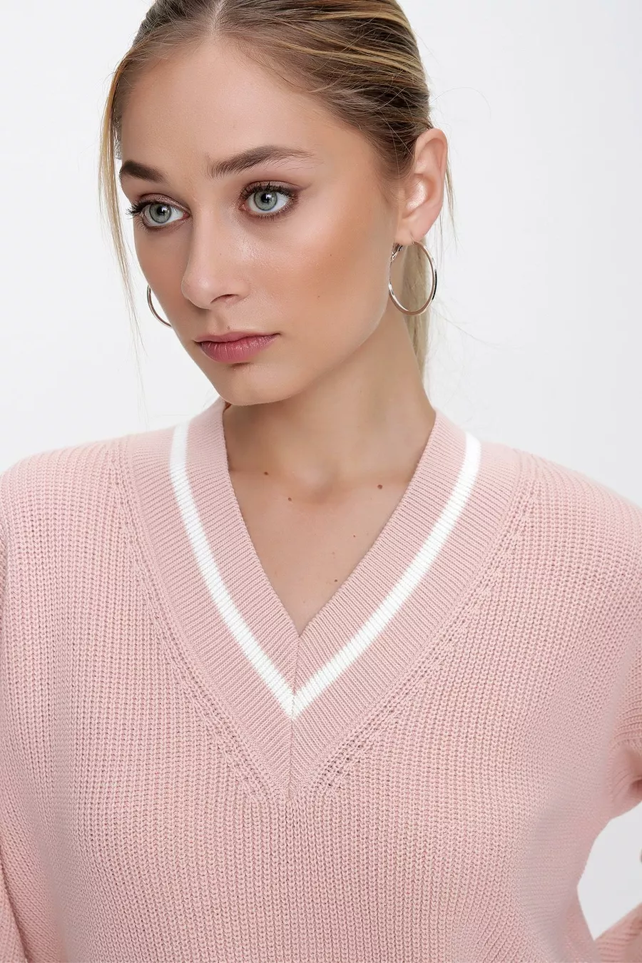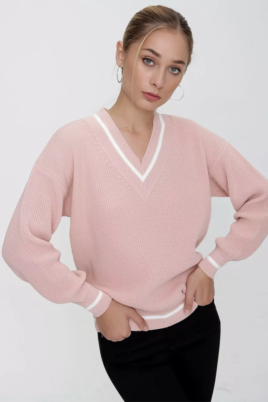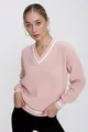 Damestrui in Selanik-stijl met poederkleurige V-hals, contrastlijnen en comfortabele pasvorm