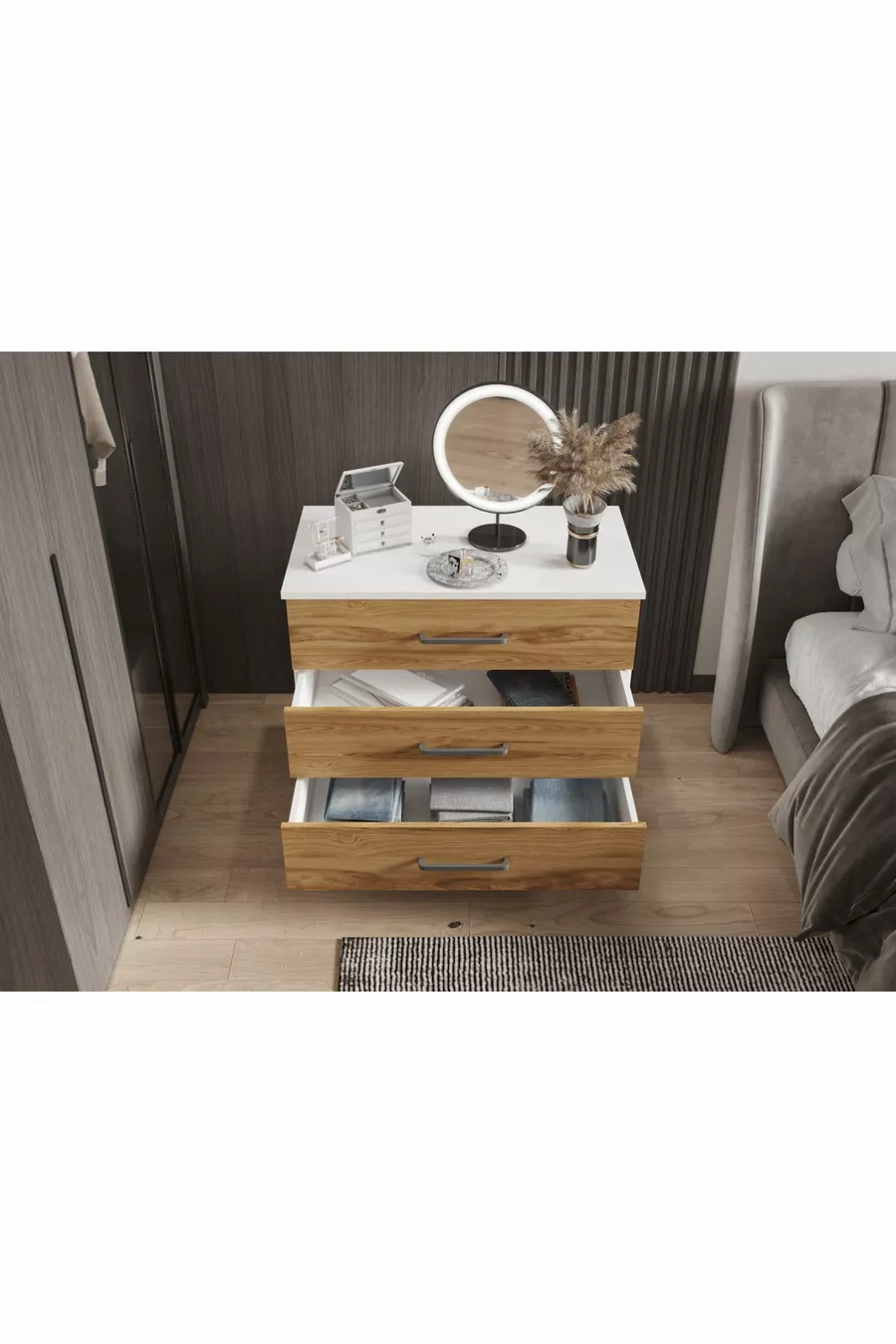 Kleur: Bruin Garantieperiode: 2 jaar Materiaal: Suntalam Hoogte: 60 cm Breedte: 80 cm Diepte: 45 cm Aantal lades: 3 Productkenmerk: Met lades Stijl: Modern Thema / Stijl: Modern Kenmerk: Met lades