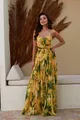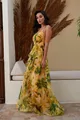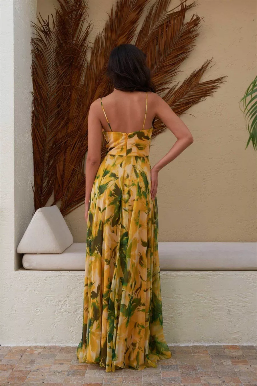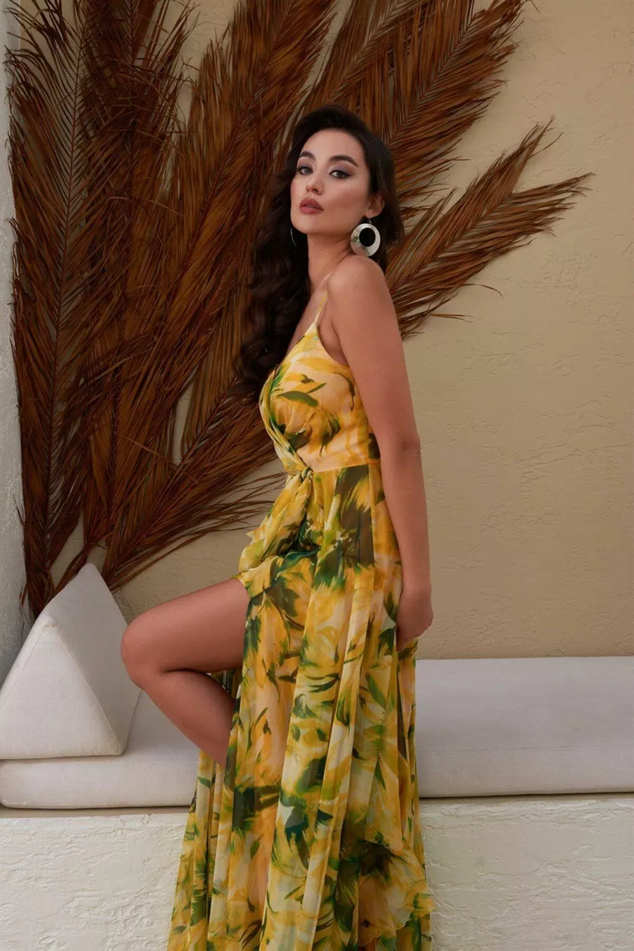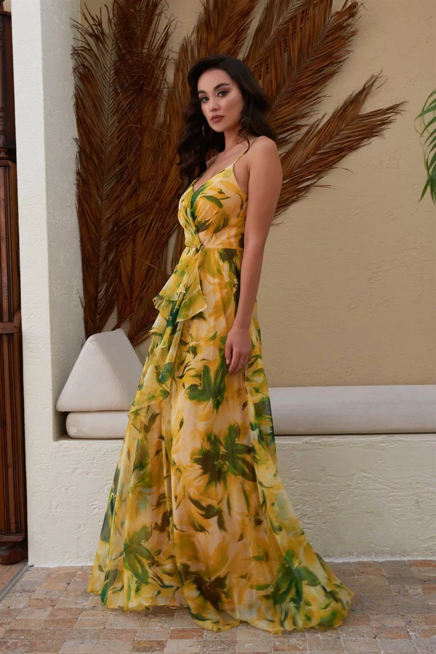 Gele geïmpregneerde spleet lange avondjurk met bandjes