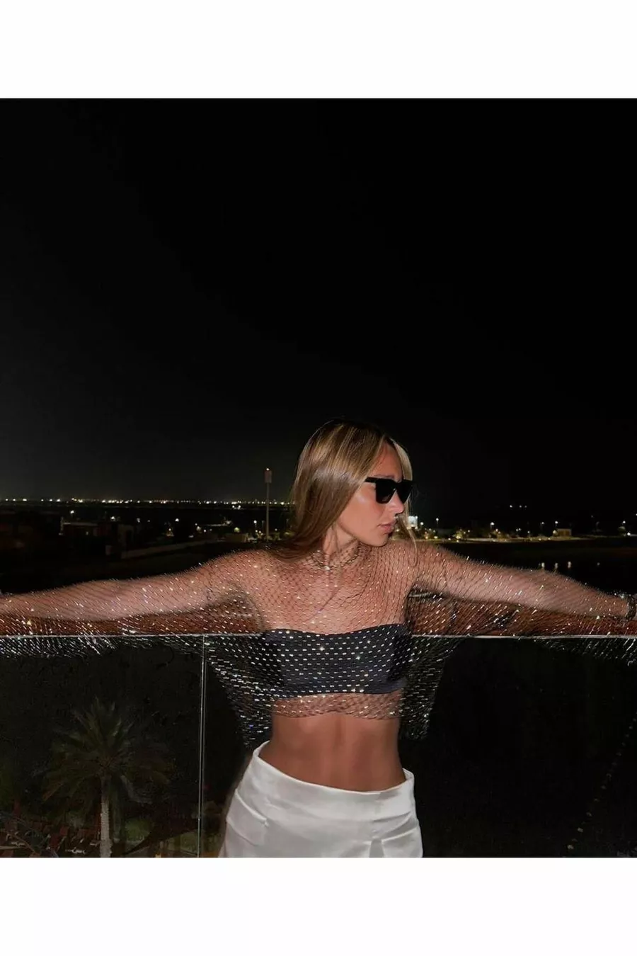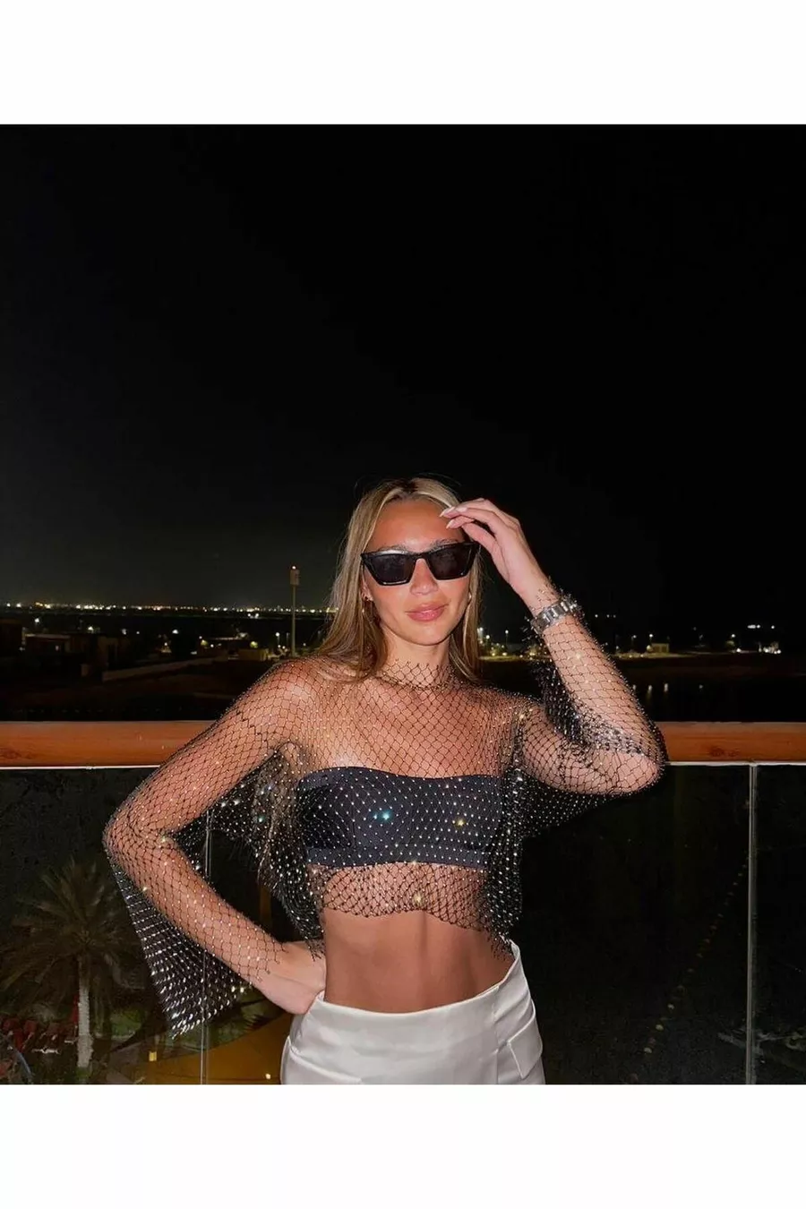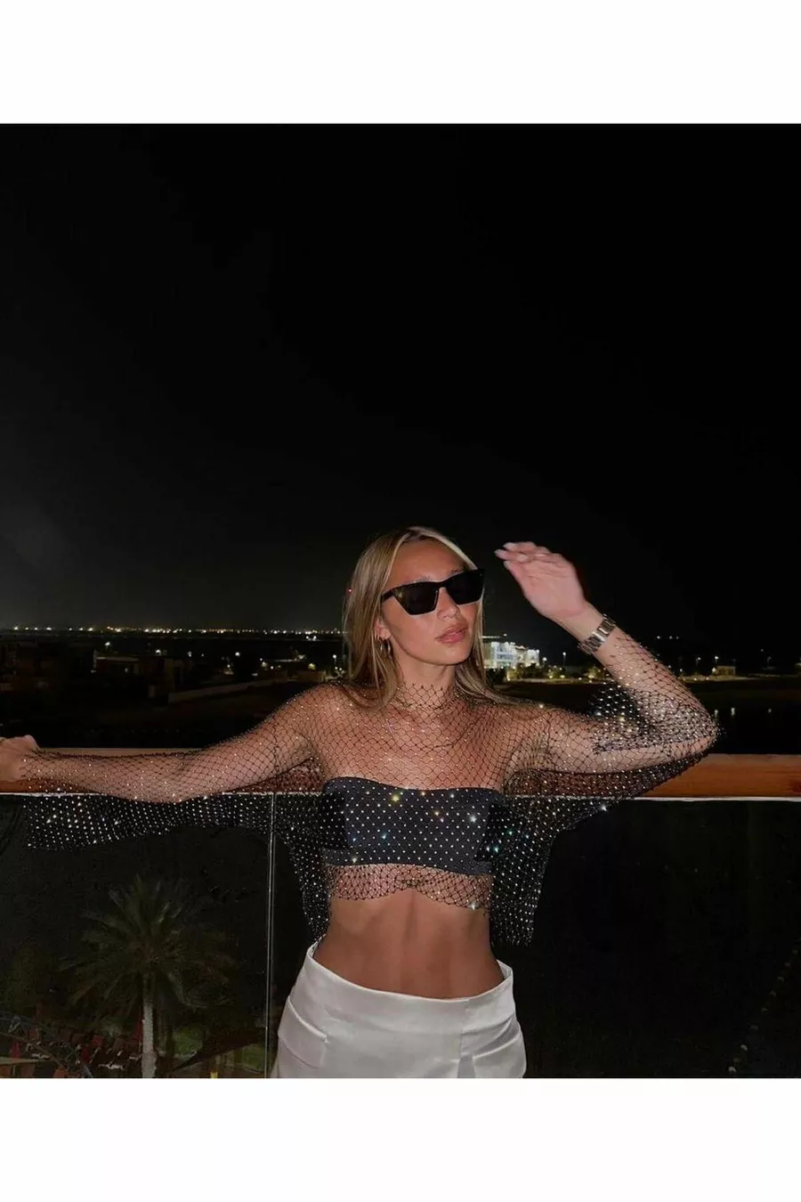 Glinsterende Steentjes Mesh Blouse Zwarte Geperforeerde Blouse Crop Top Bustier Lange Mouwen Kerst Nieuwjaar