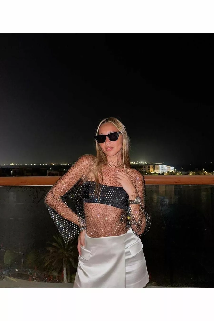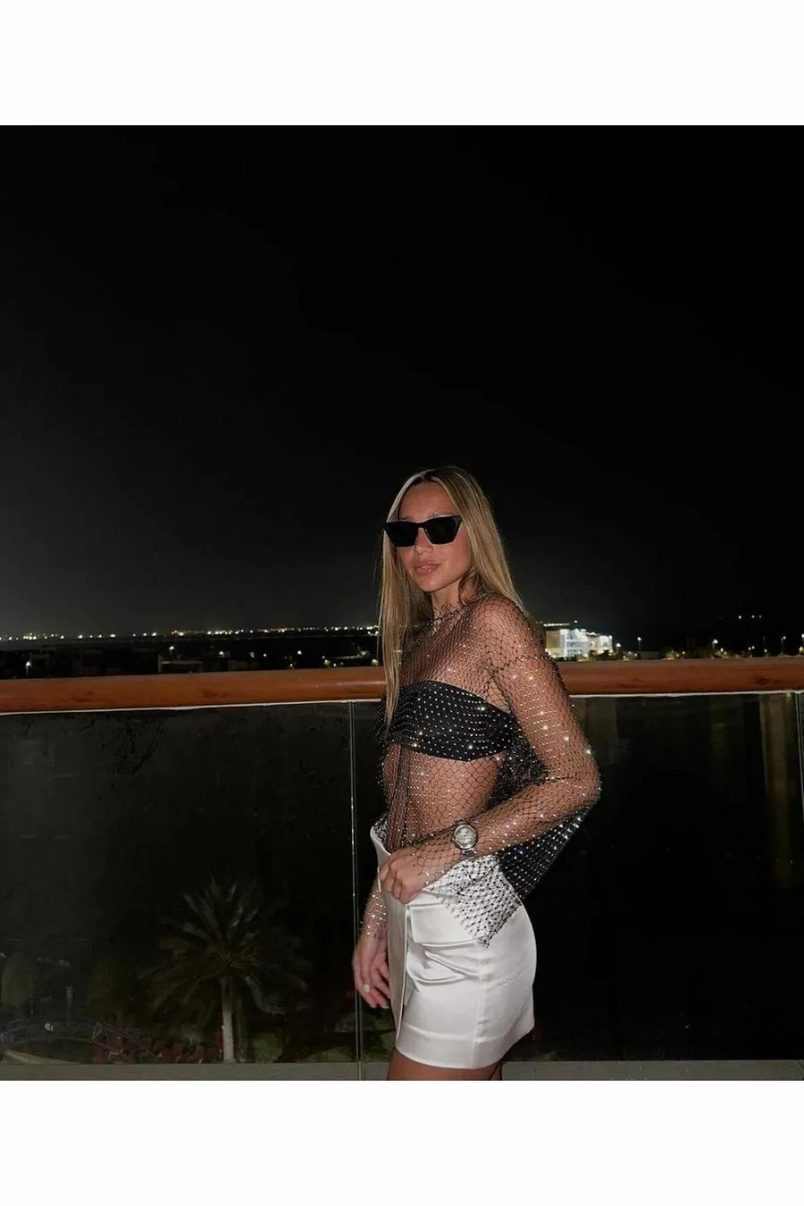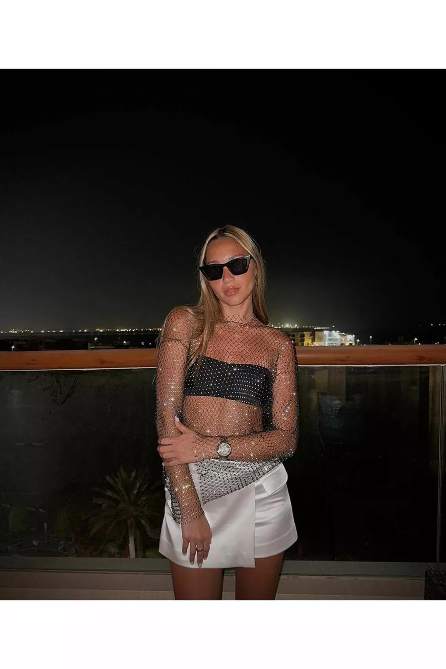 Glinsterende Steentjes Mesh Blouse Zwarte Geperforeerde Blouse Crop Top Bustier Lange Mouwen Kerst Nieuwjaar